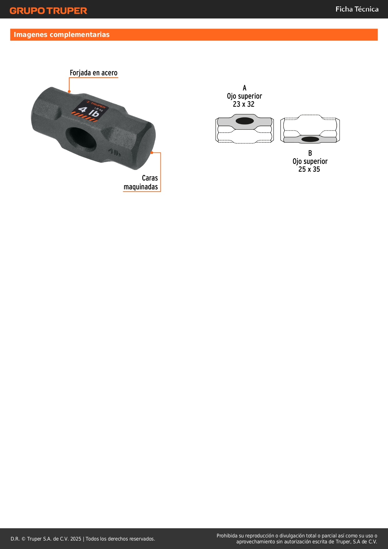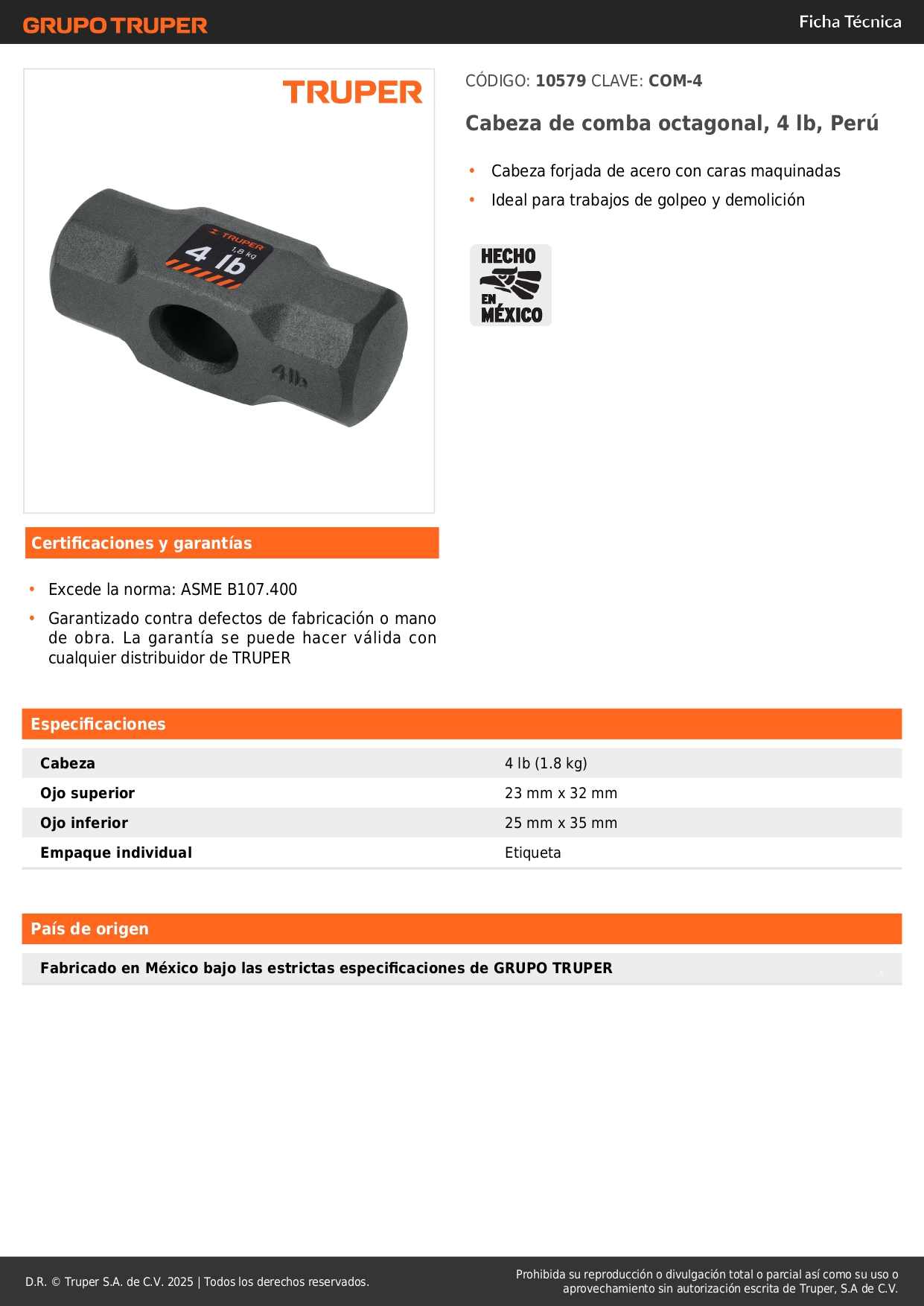 Cabeza de comba octagonal de 4 lb, Truper Stock por sucursal Stock por sucursal S/ 20.20 cantidad Agregar al carro Avísame cuando llegue -Cabeza forjada de acero con caras maquinadas-Ideal para trabajos de golpeo y demolición