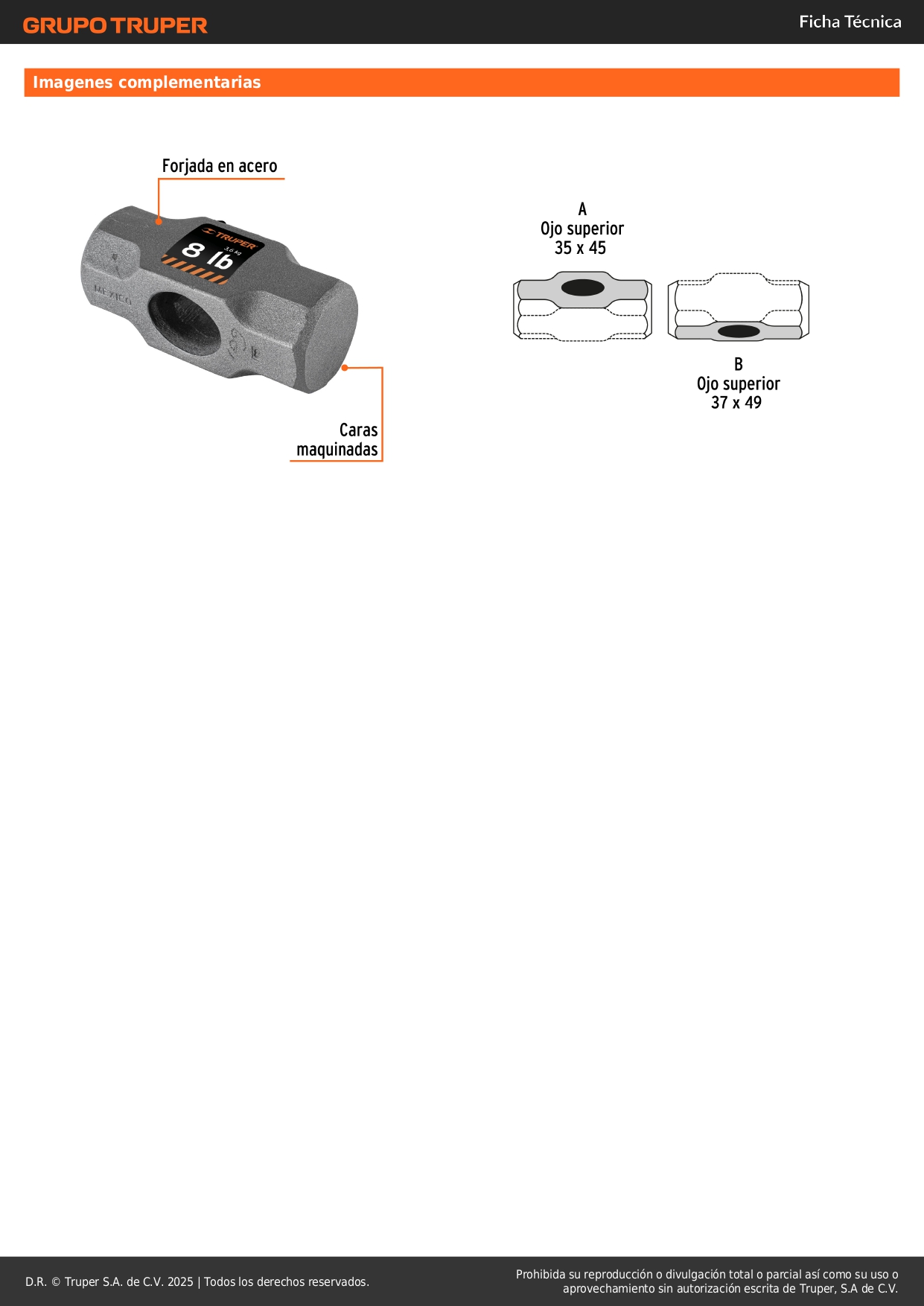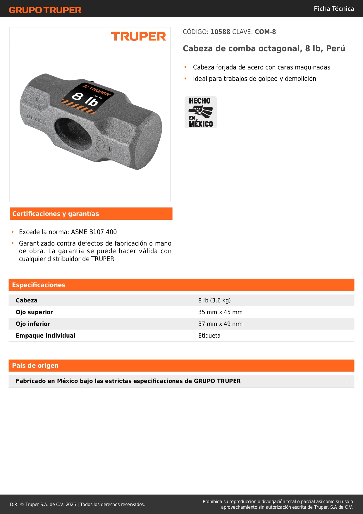 Cabeza de comba octagonal de 8 lb, Truper Stock por sucursal Stock por sucursal S/ 44.20 cantidad Agregar al carro Avísame cuando llegue -Cabeza forjada de acero con caras maquinadas-Ideal para trabajos de golpeo y demolición