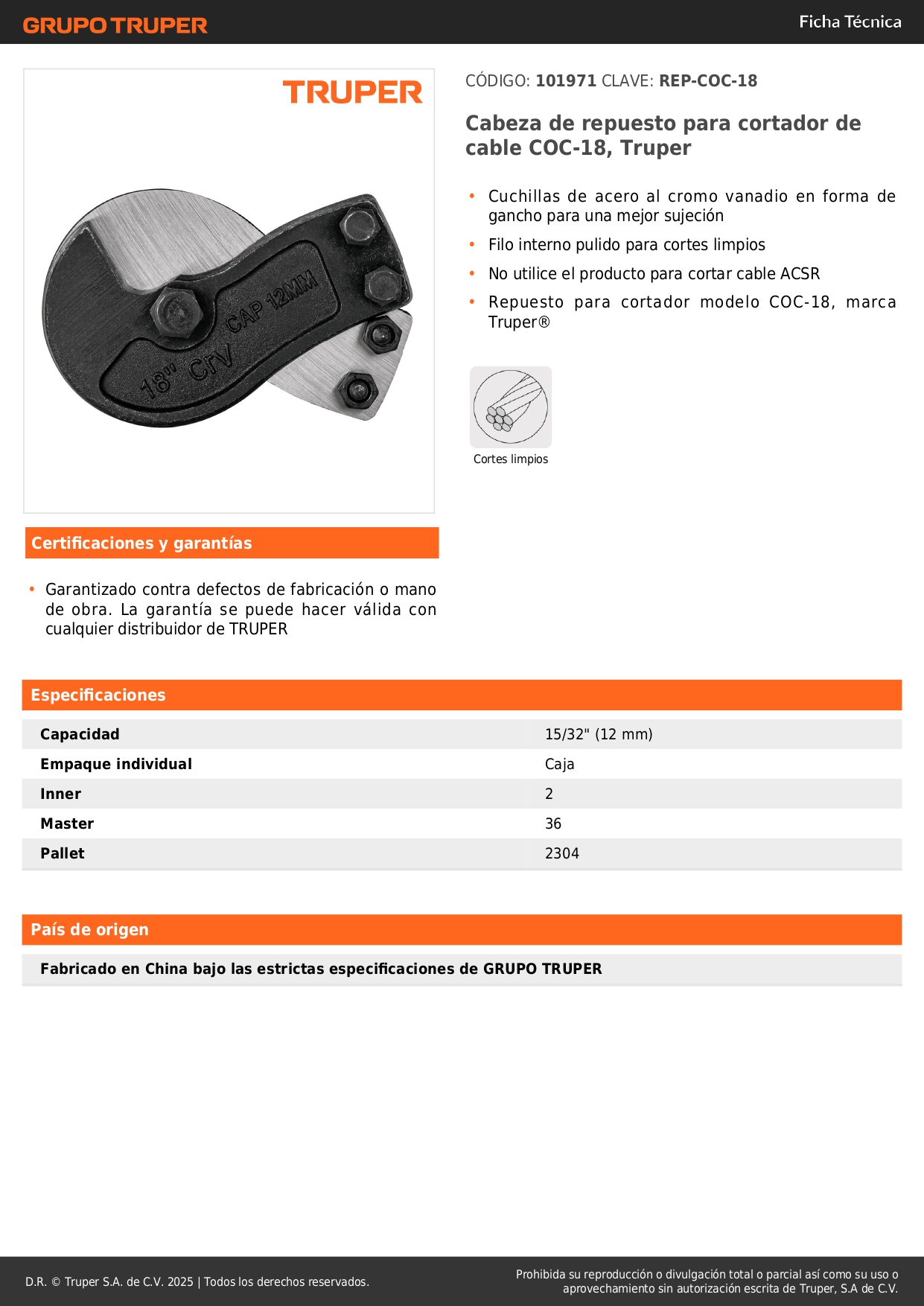 Cabeza de repuesto para cortador de cable COC-18, Truper