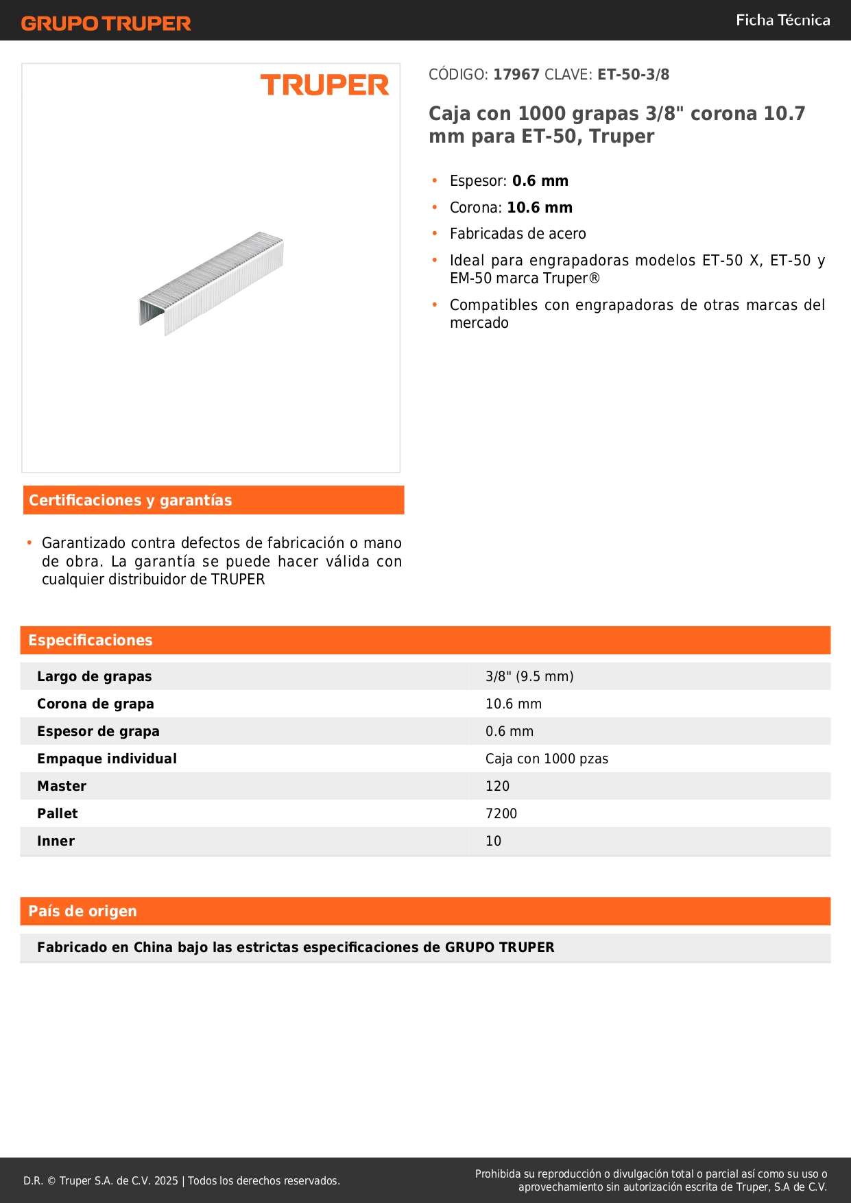 Caja con 1000 grapas 3/8" corona 10.7 mm para ET-50 Truper