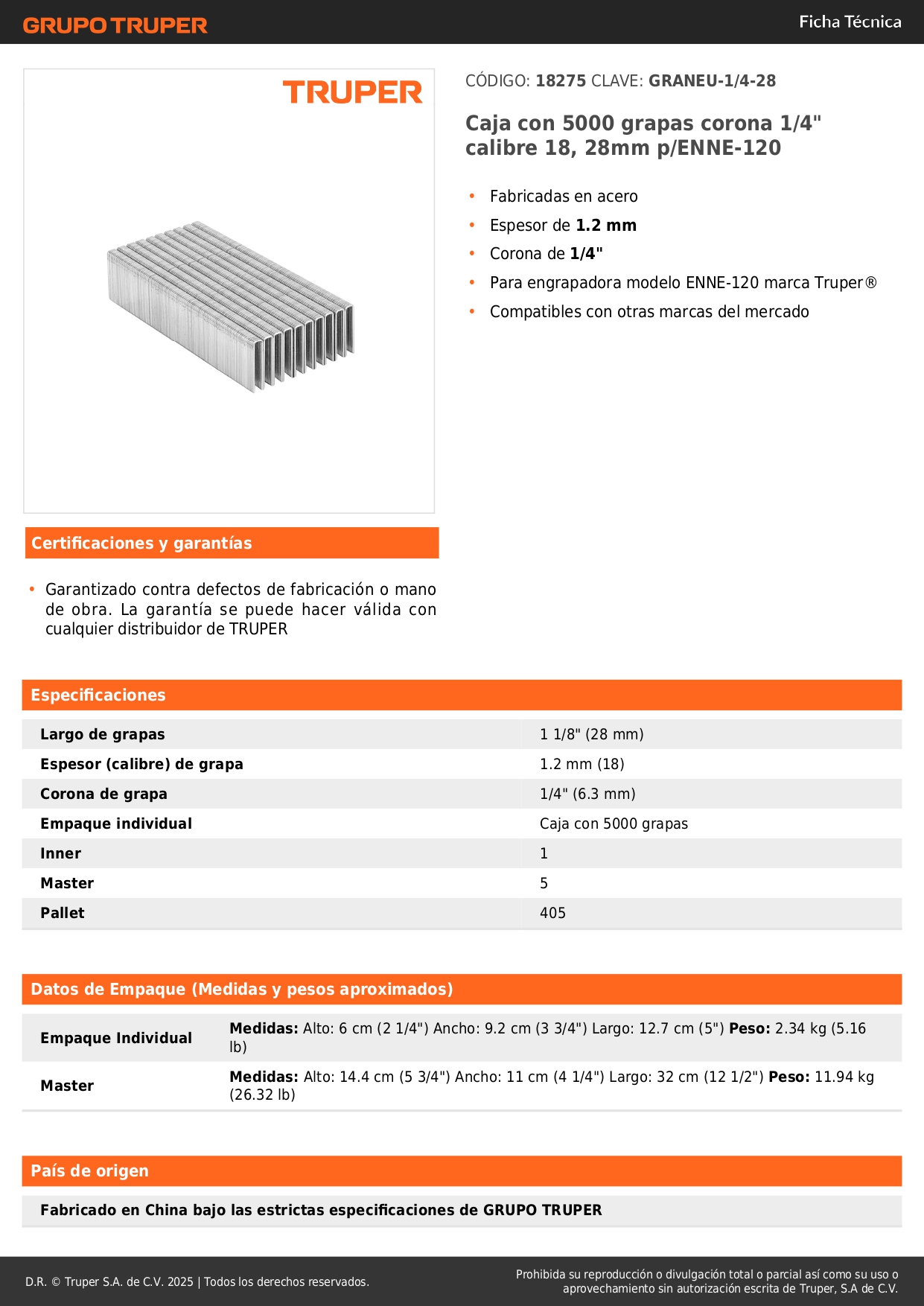 Caja con 5000 grapas corona 1/4´´ calibre 18, 28mm p/ENNE-120 Truper