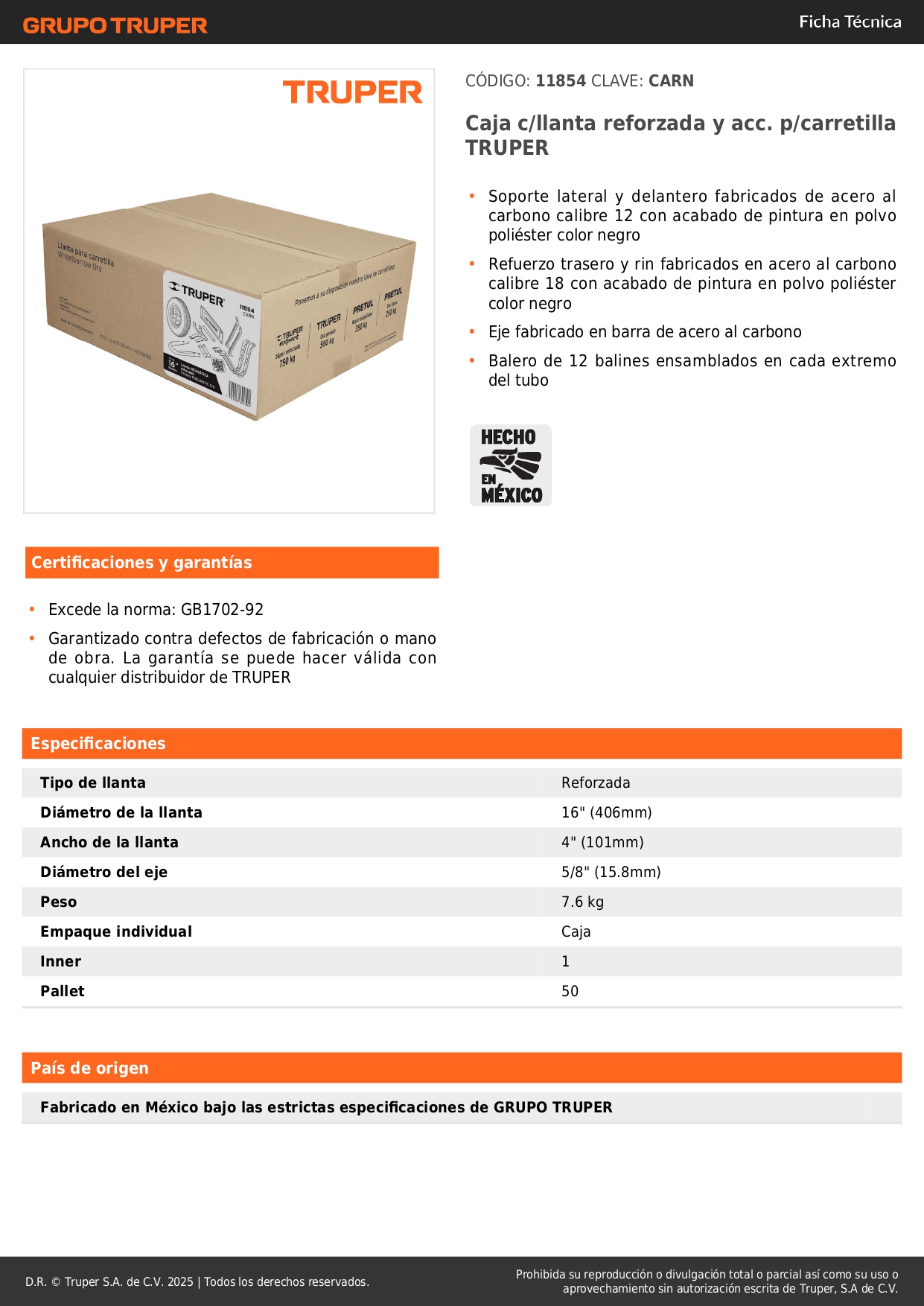 - Refuerzo trasero y rin fabricados en acero al carbono calibre 18 con acabado de pintura en polvo poliéster color negro.