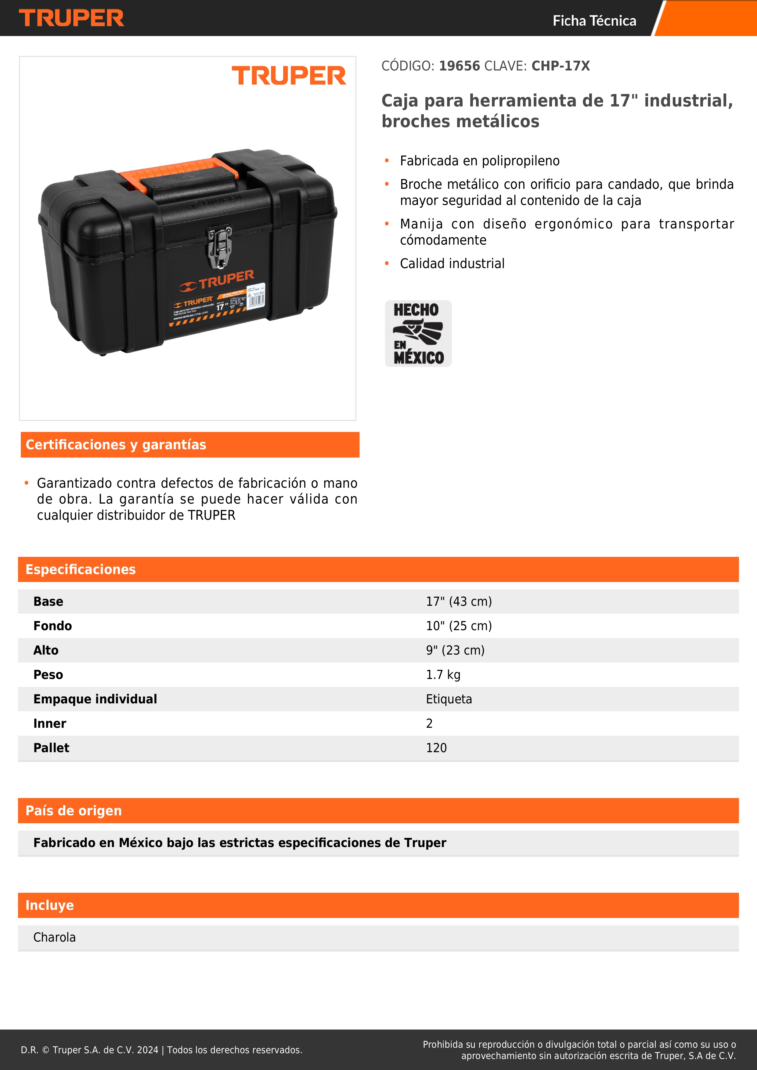 Caja para Herramientas 17" Industrial con broche metalico Truper