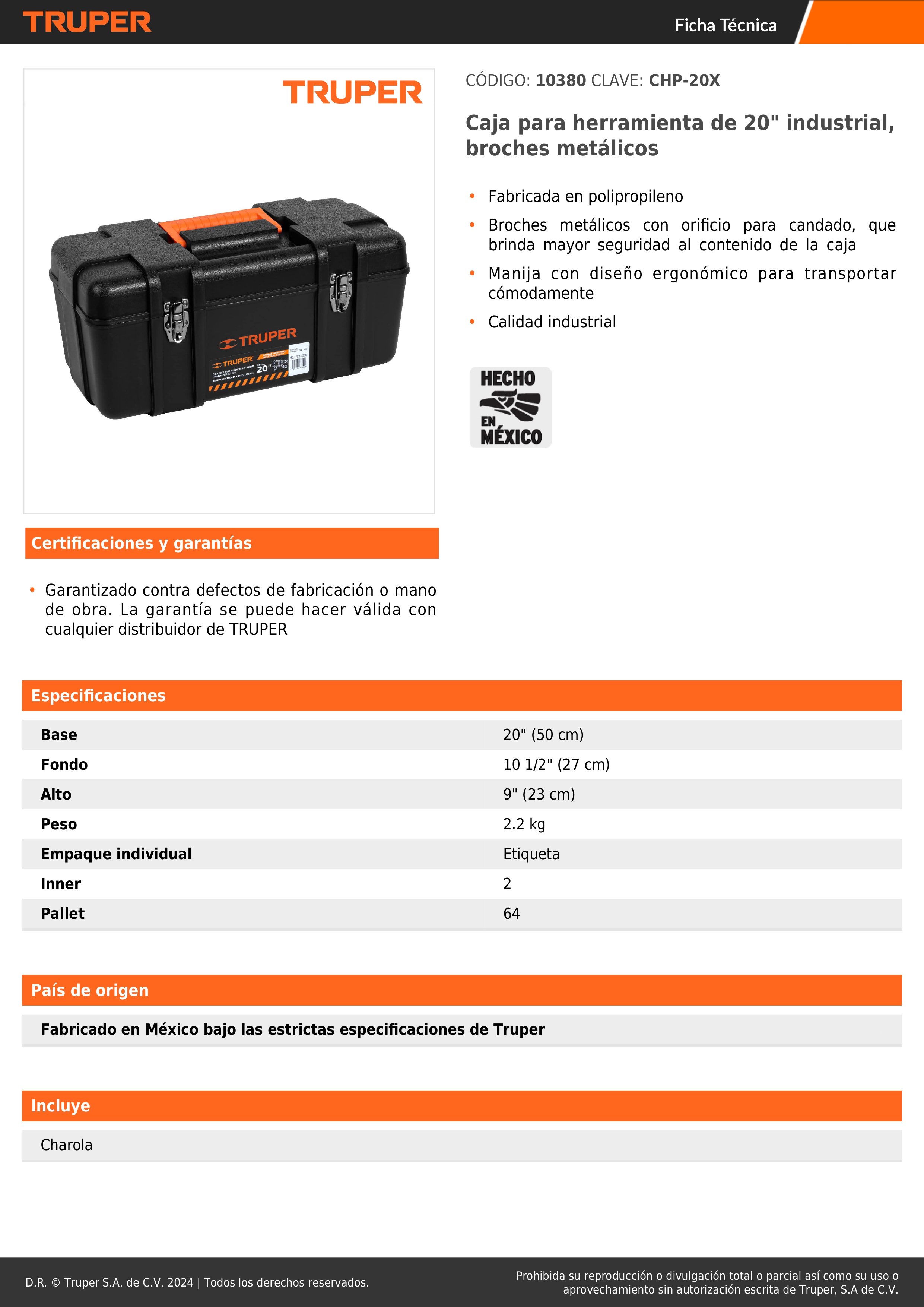 • Broche metálico con orificio para candado, que brinda mayor seguridad al contenido de la caja