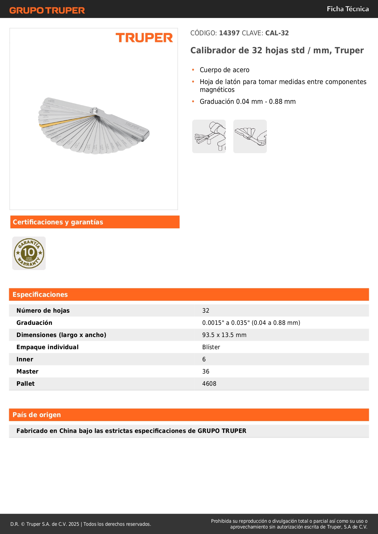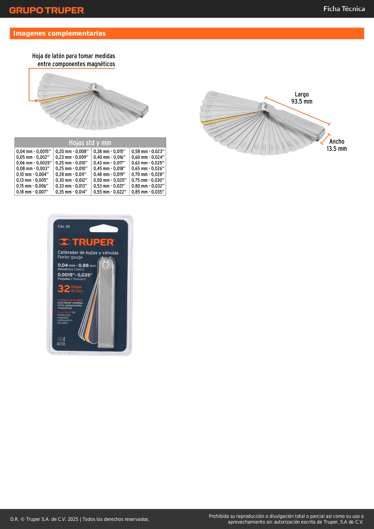 Calibrador de Bujías y válvulas 32 hojas STD mm Truper
