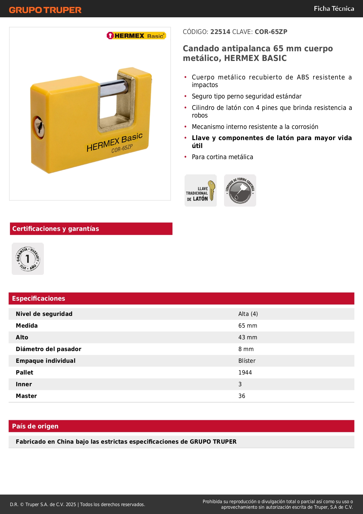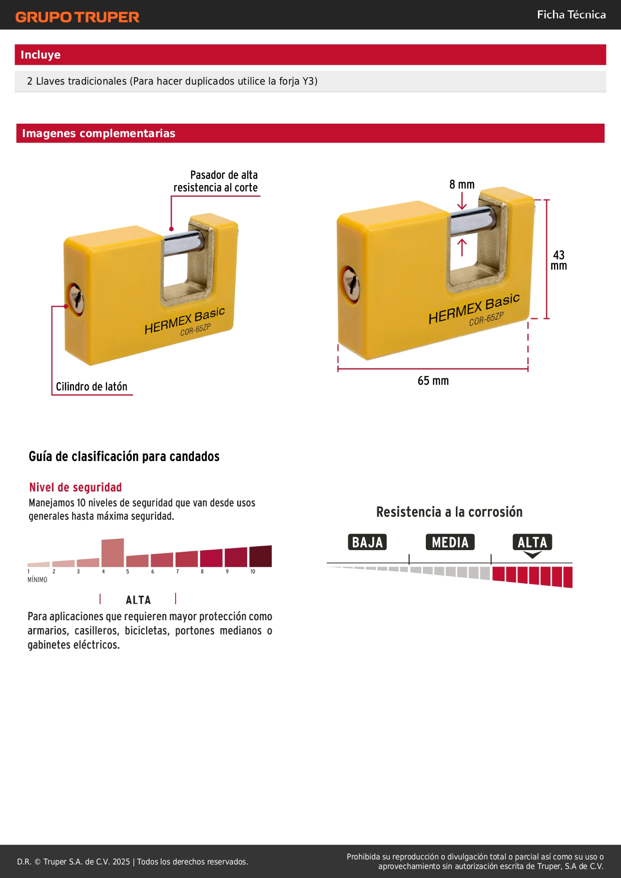 Candado antipalanca 65 mm cuerpo metálico, Hermex Basic
