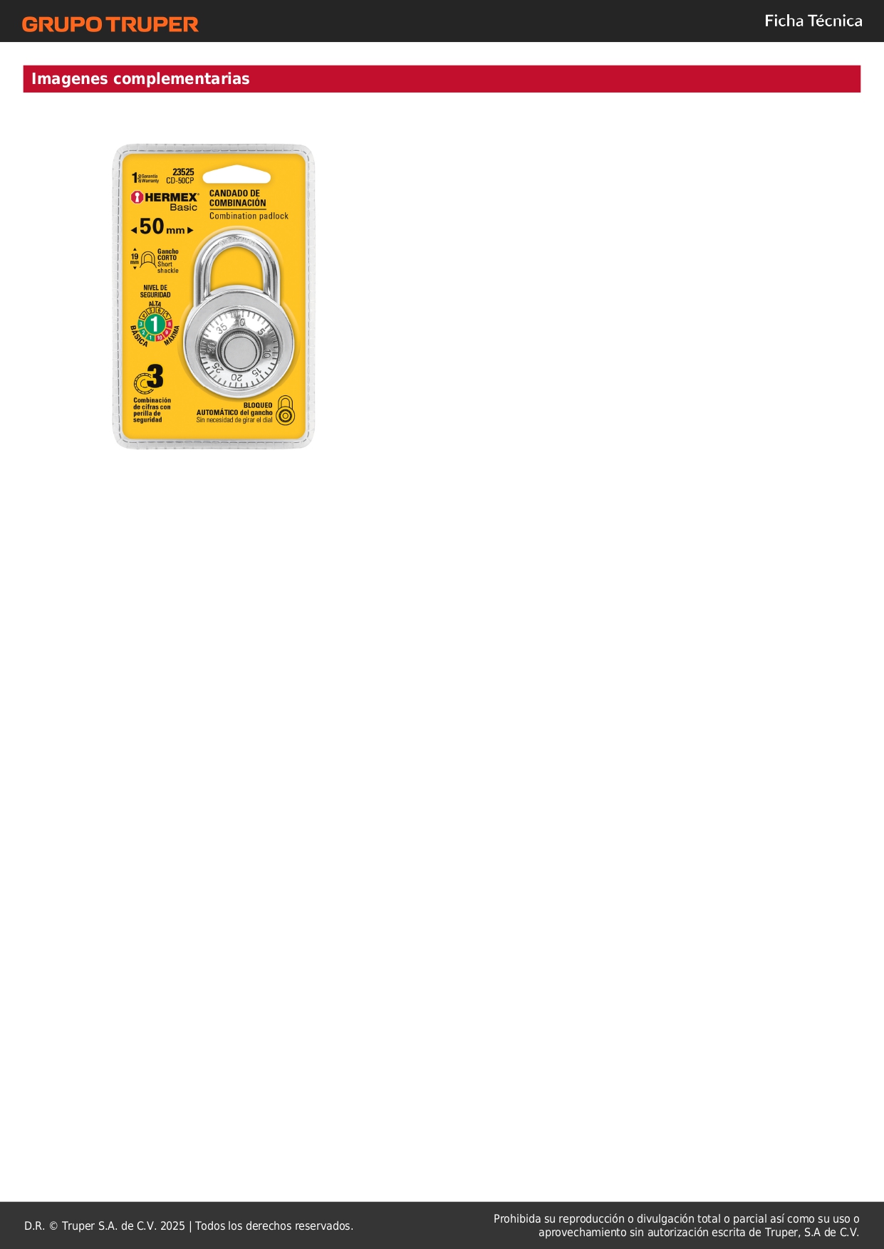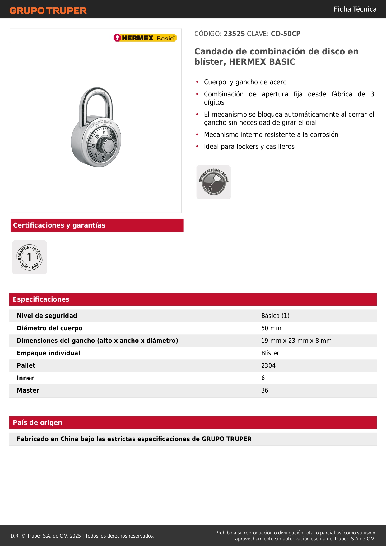 - Combinación de apertura fija desde fábrica de 3 dígitos.