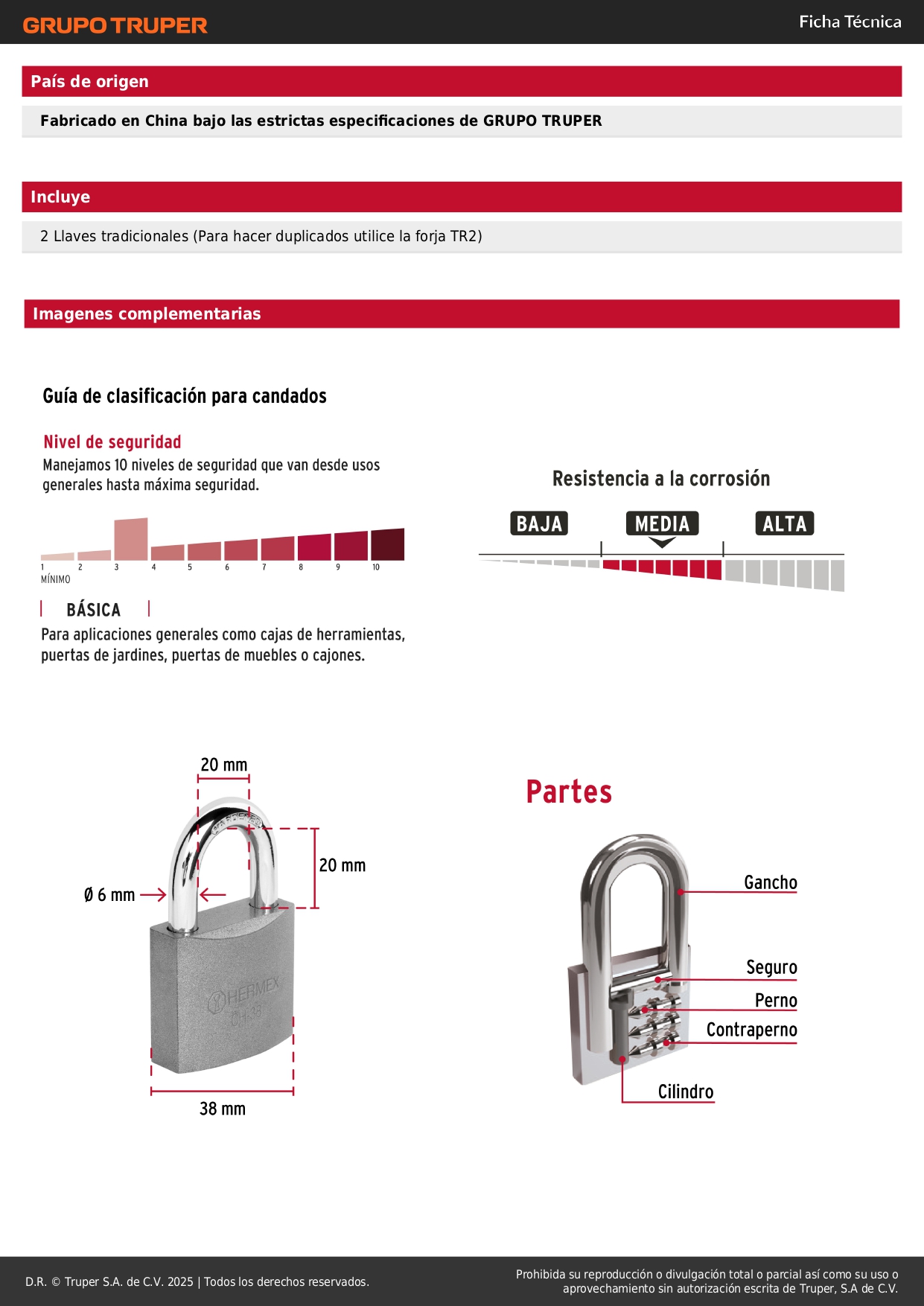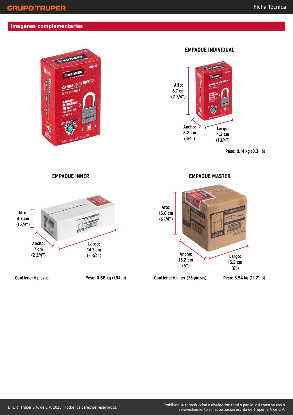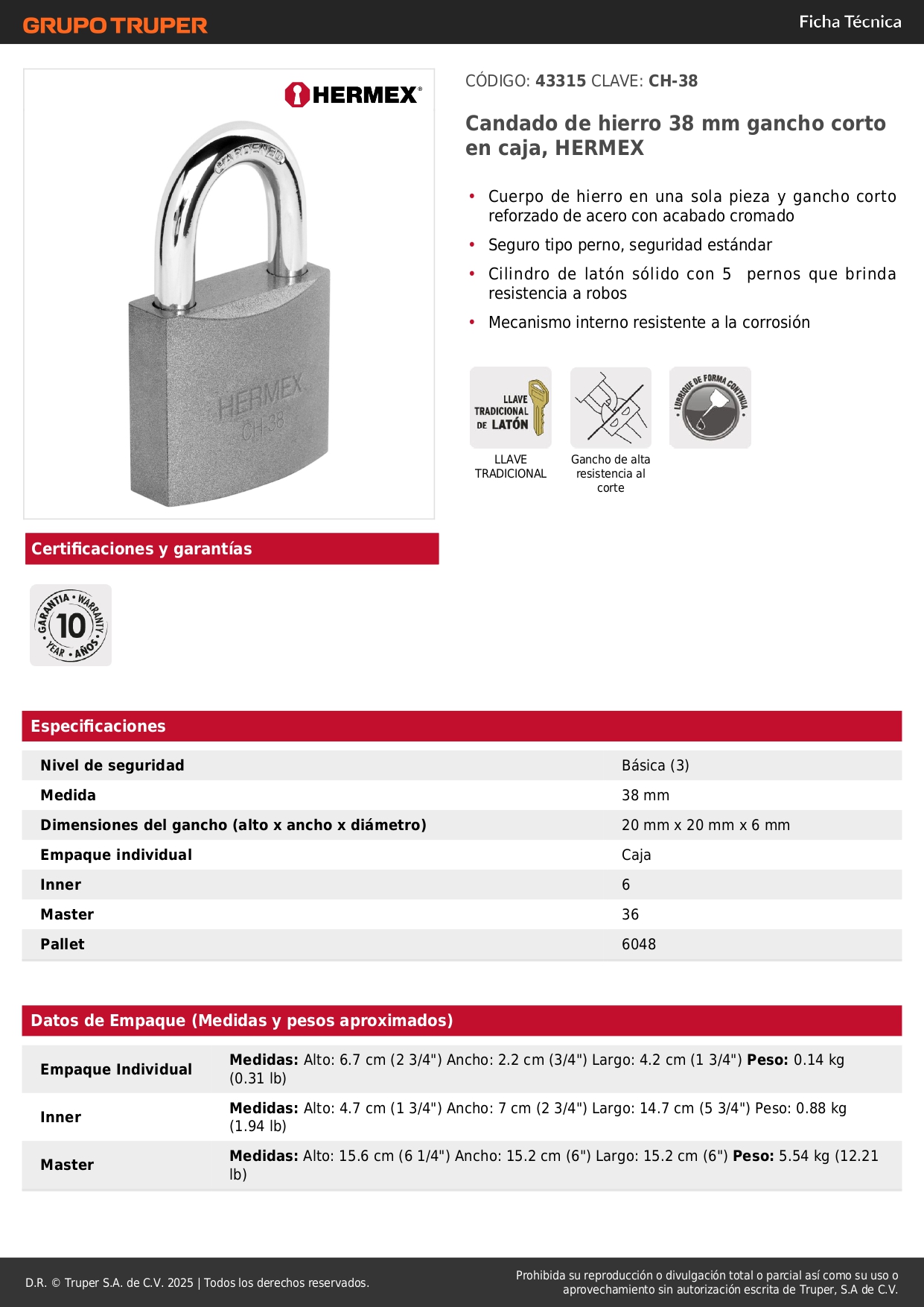 Candado de hierro 38 mm arco normal en caja. hermex
