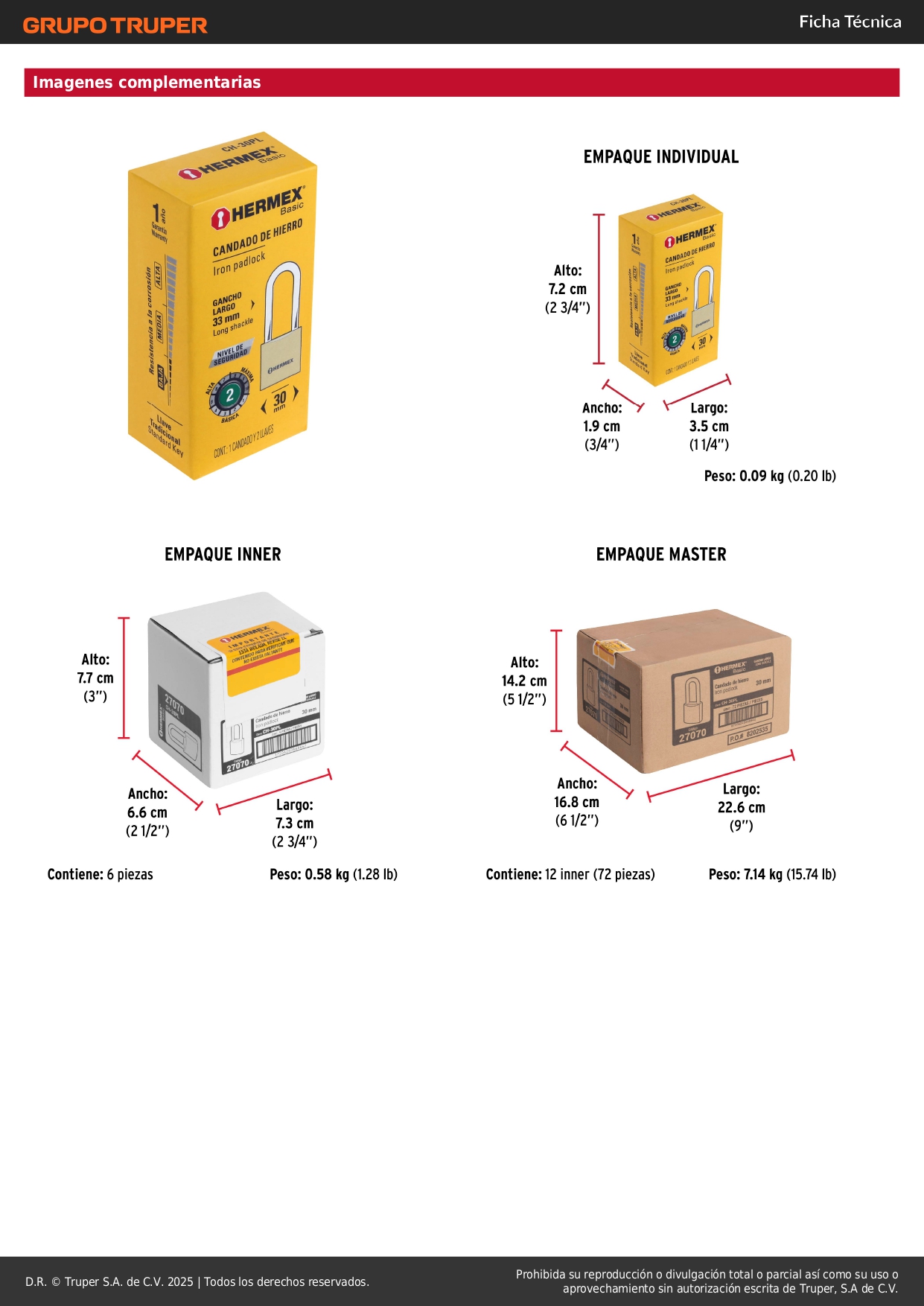 Candado de hierro color latón 30 mm arco largo, caja, Basic Hermex