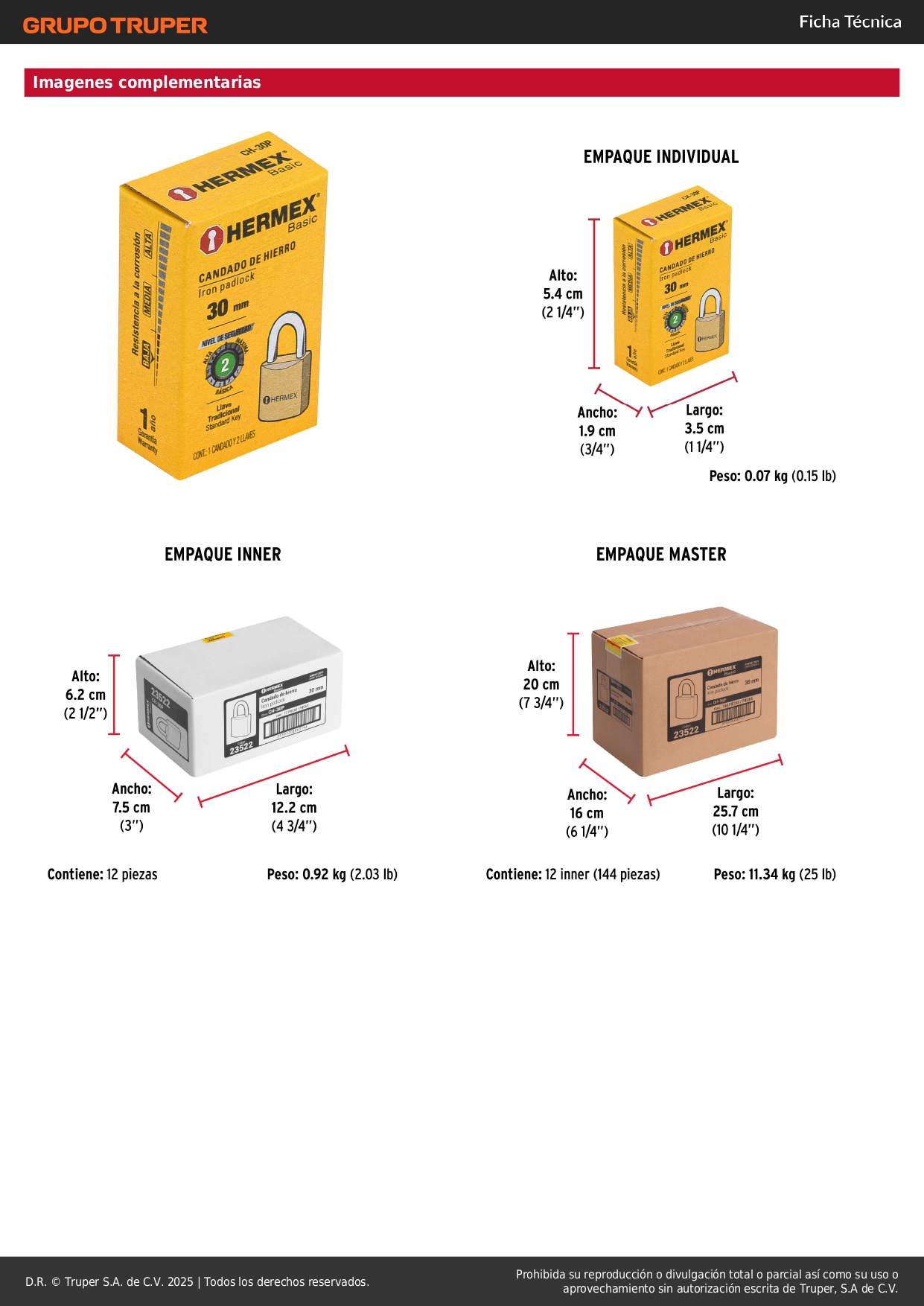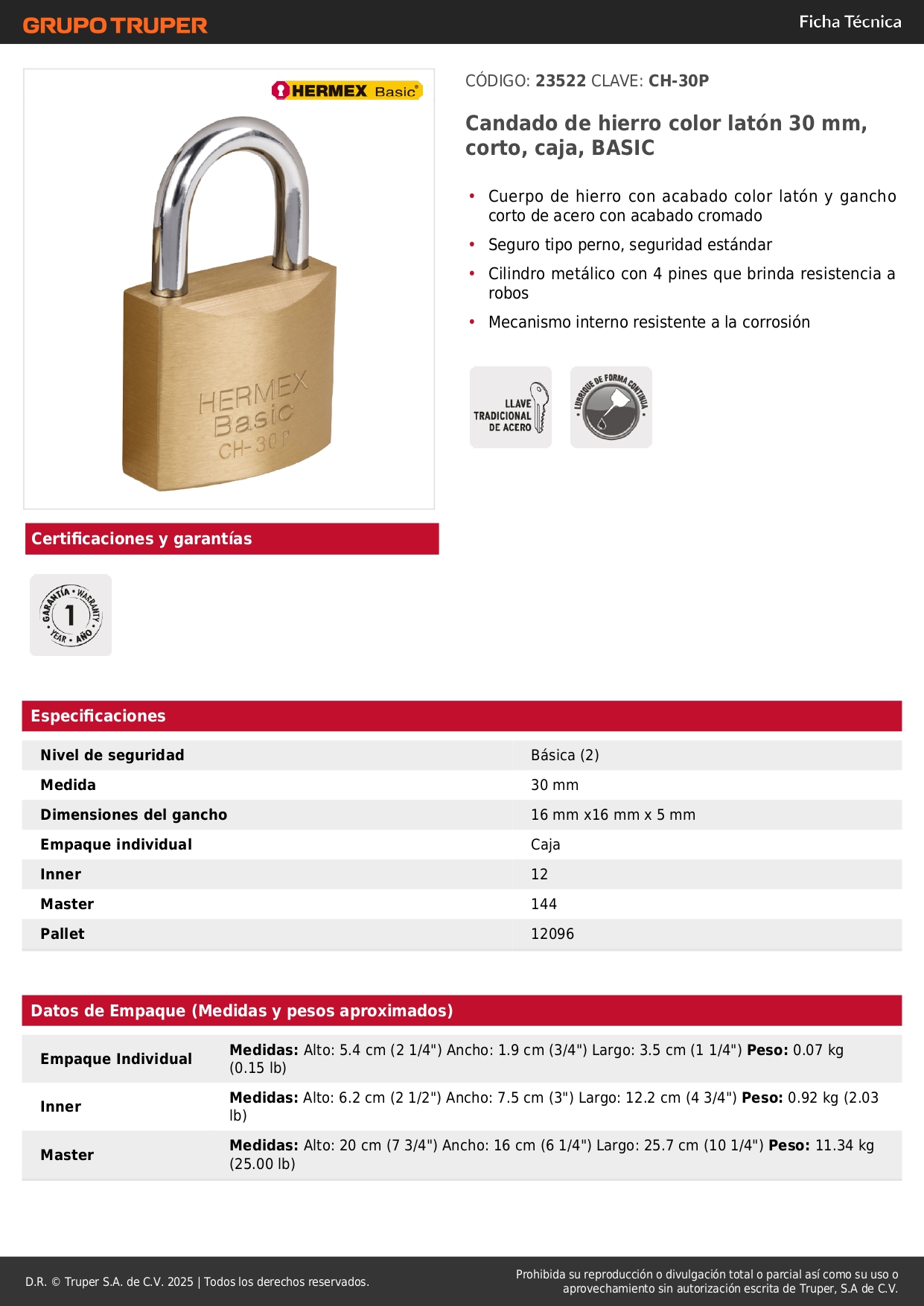 Candado de hierro color latón 30 mm arco normal, caja, Basic Hermex