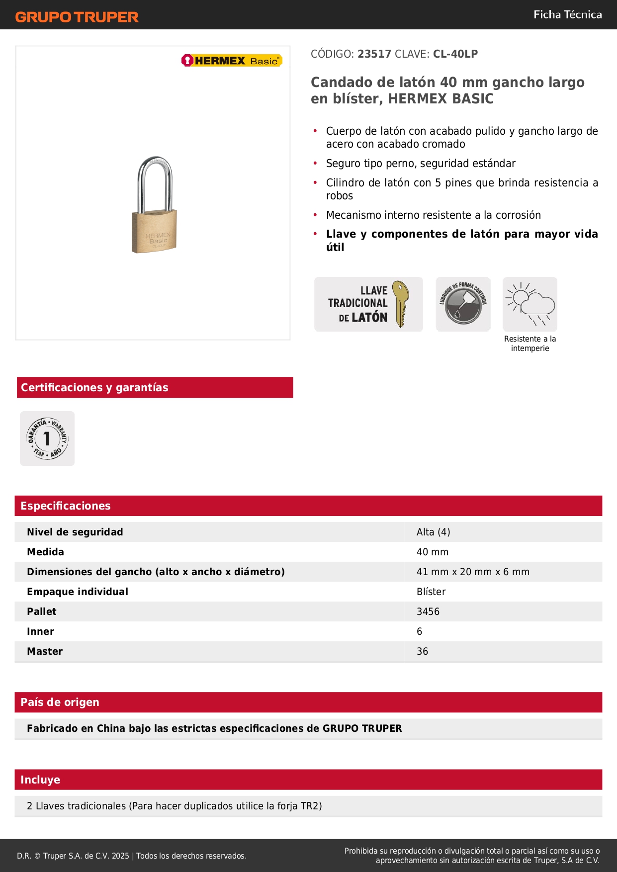 Candado de latón 40 mm arco largo, en blíster, Hermex Basic