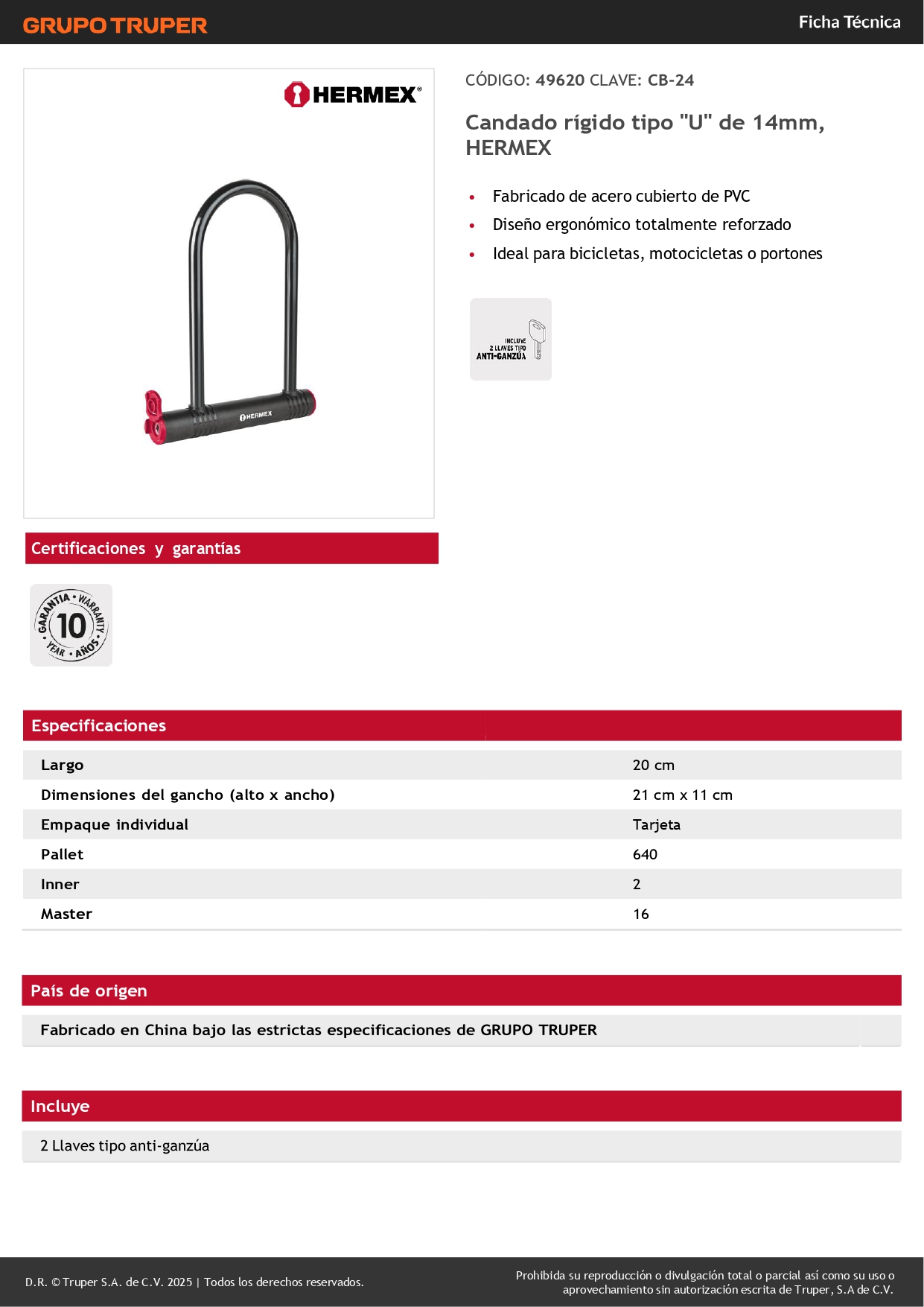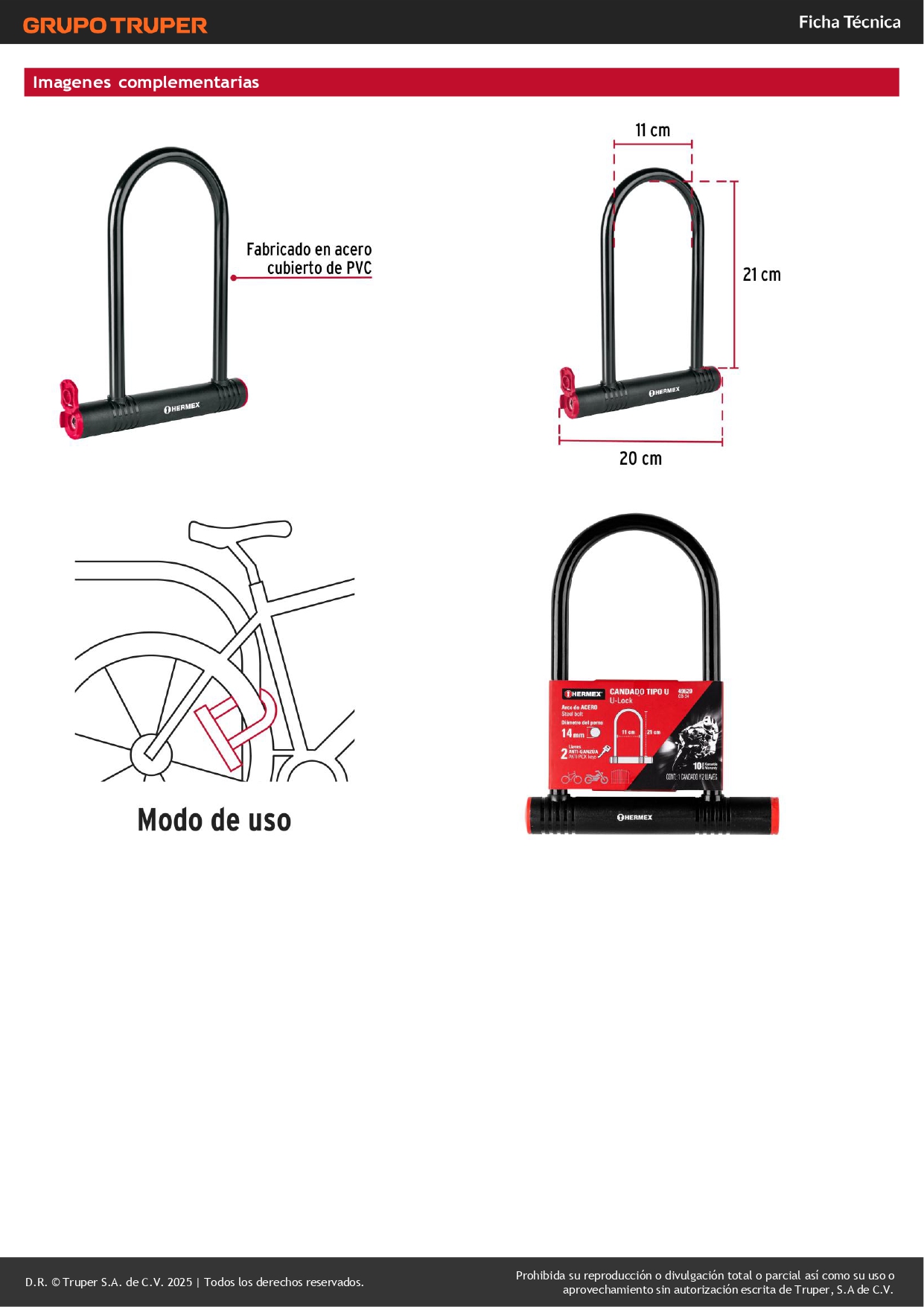 Candado Motocicleta Bicicleta Tipo U 14 mm Hermex