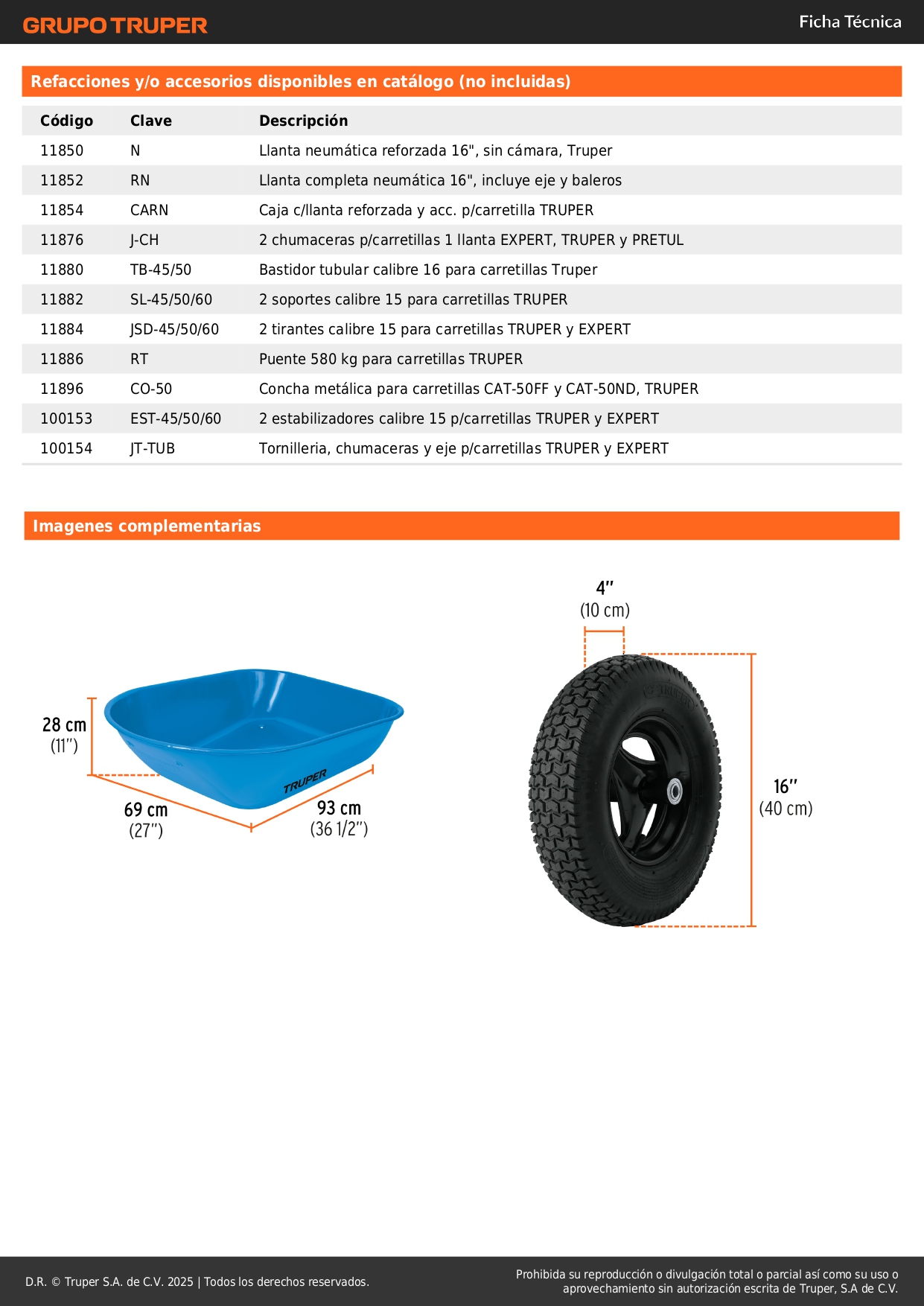 Medidas de llanta: 4" (10 cm) x 16" (41 cm).