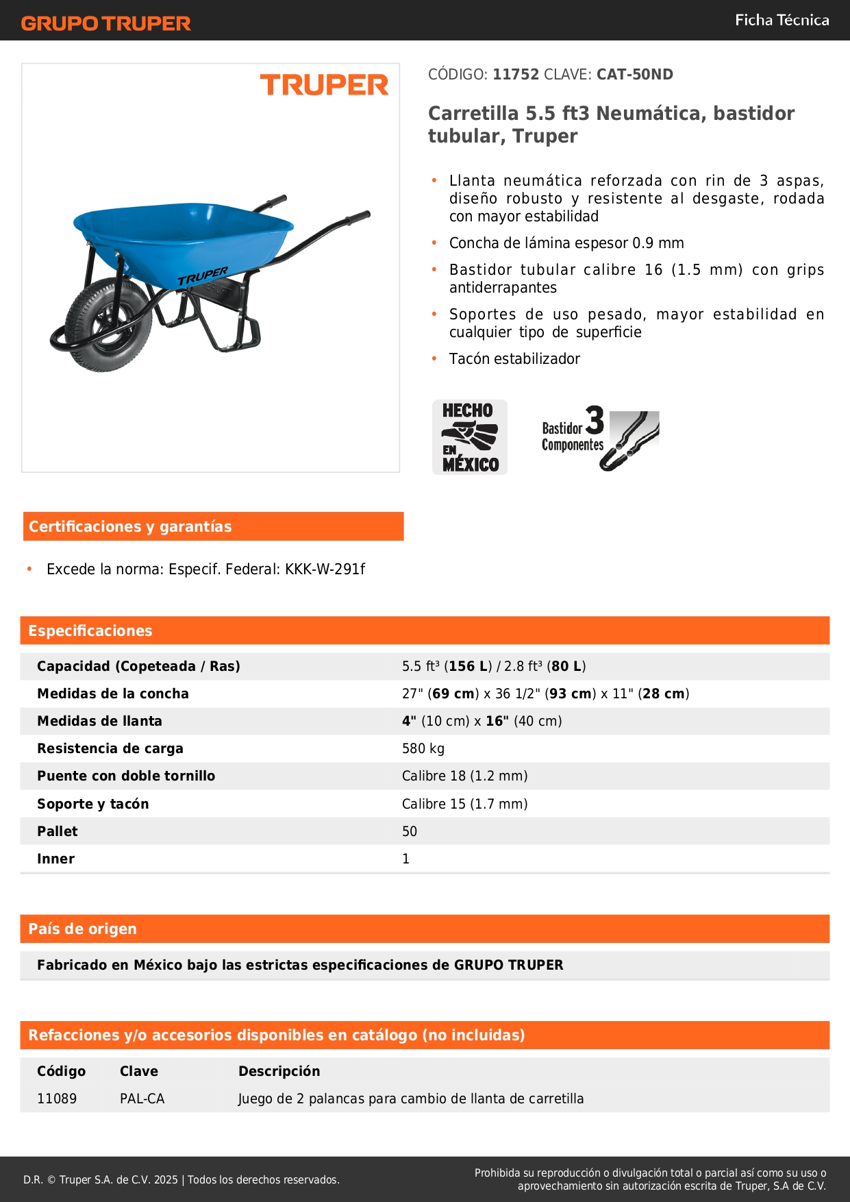 Carretilla 5.5 ft3 llanta neumática reforzada Truper