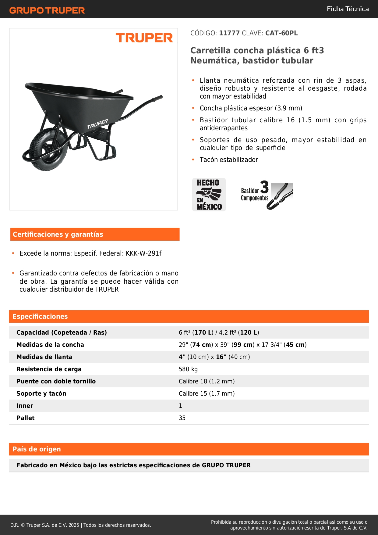 Carretilla plástica 6 ft3 llanta neumática reforzada Truper