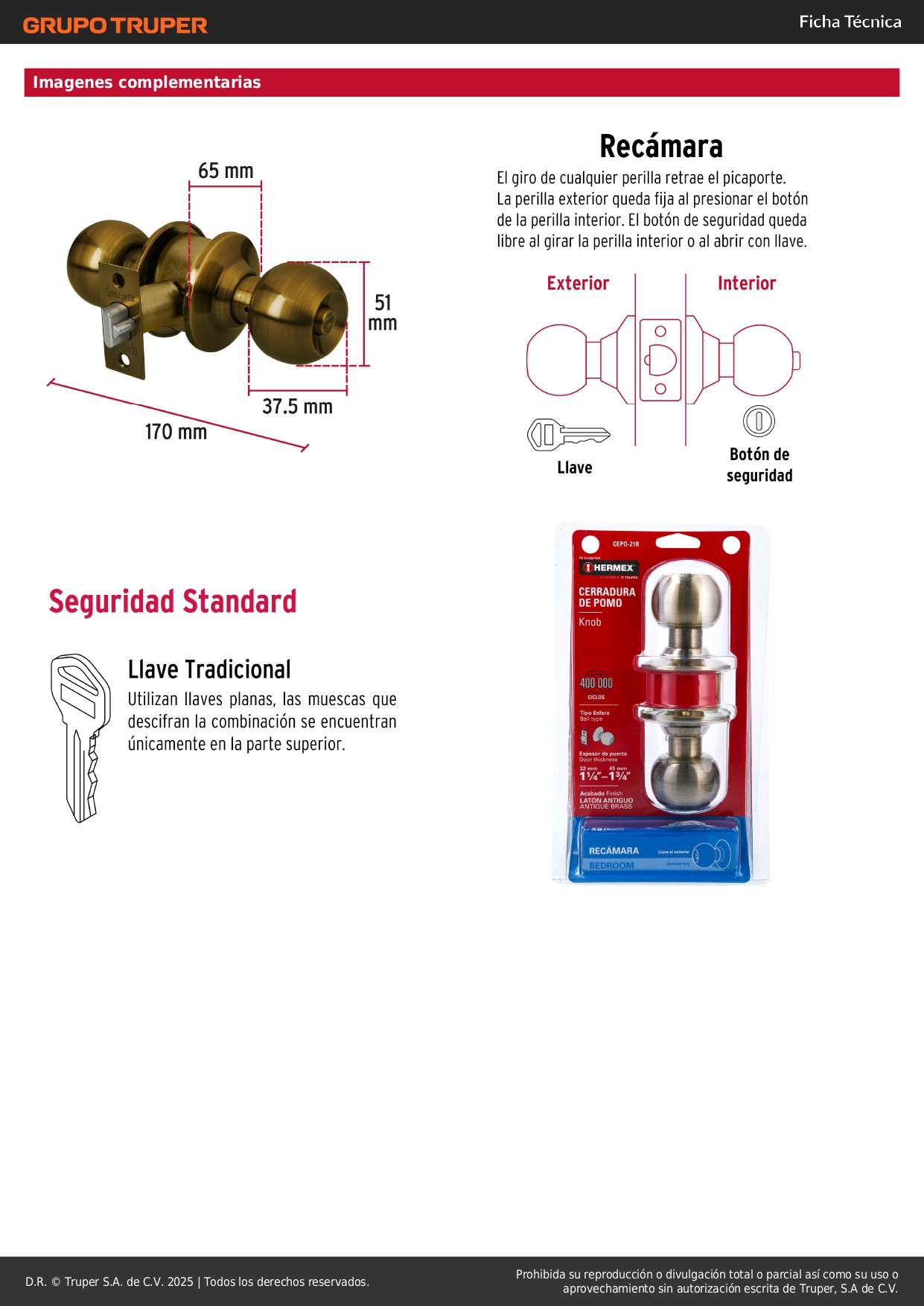 Cerradura tipo esfera para recámara, latón antiguo, Hermex