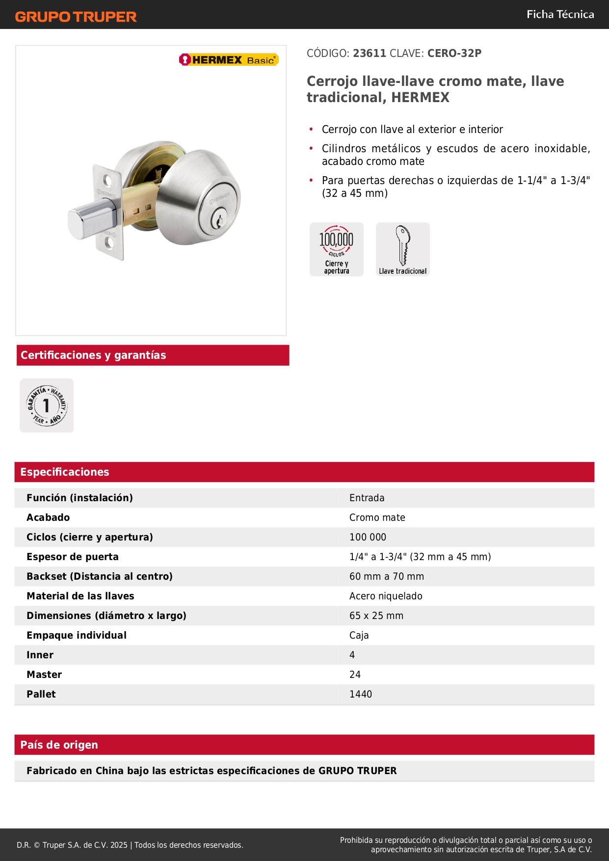 Cerrojo llave-llave cromo mate, llave tradicional, Hermex
