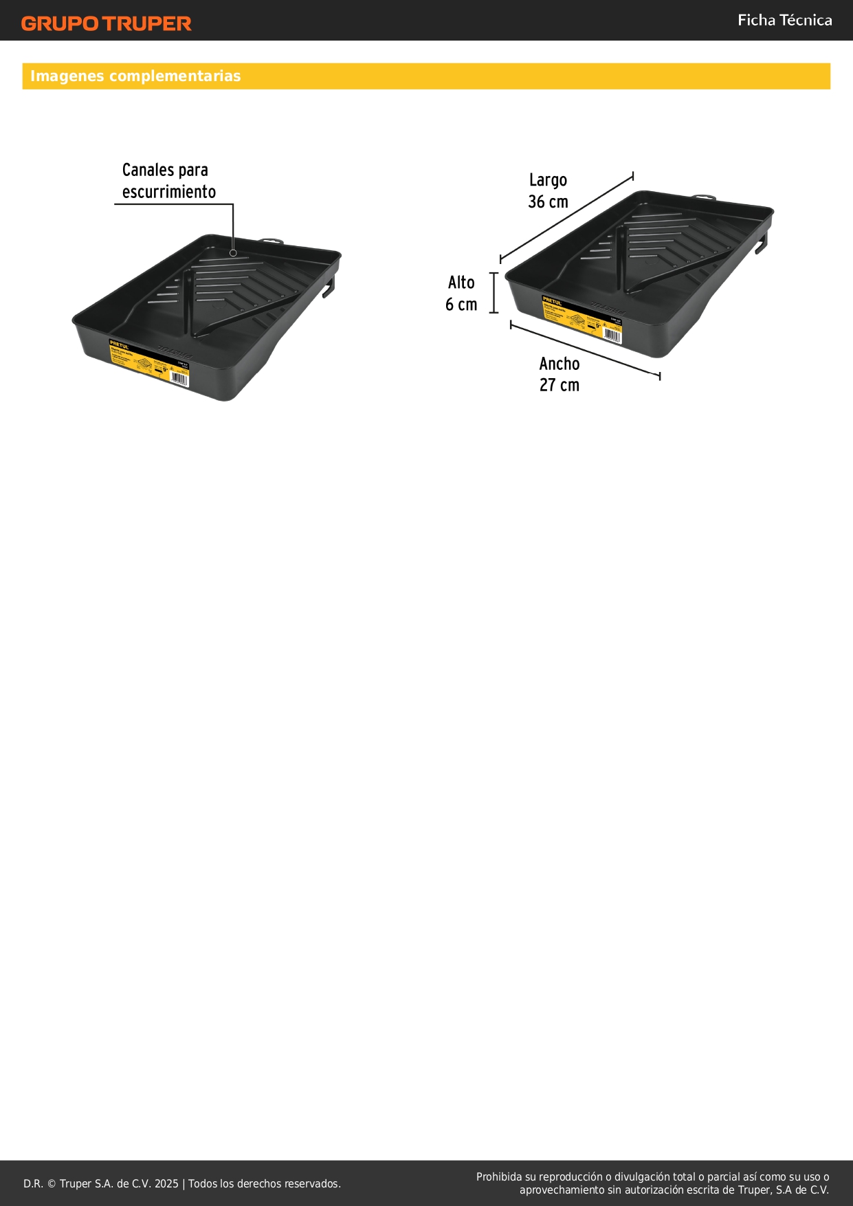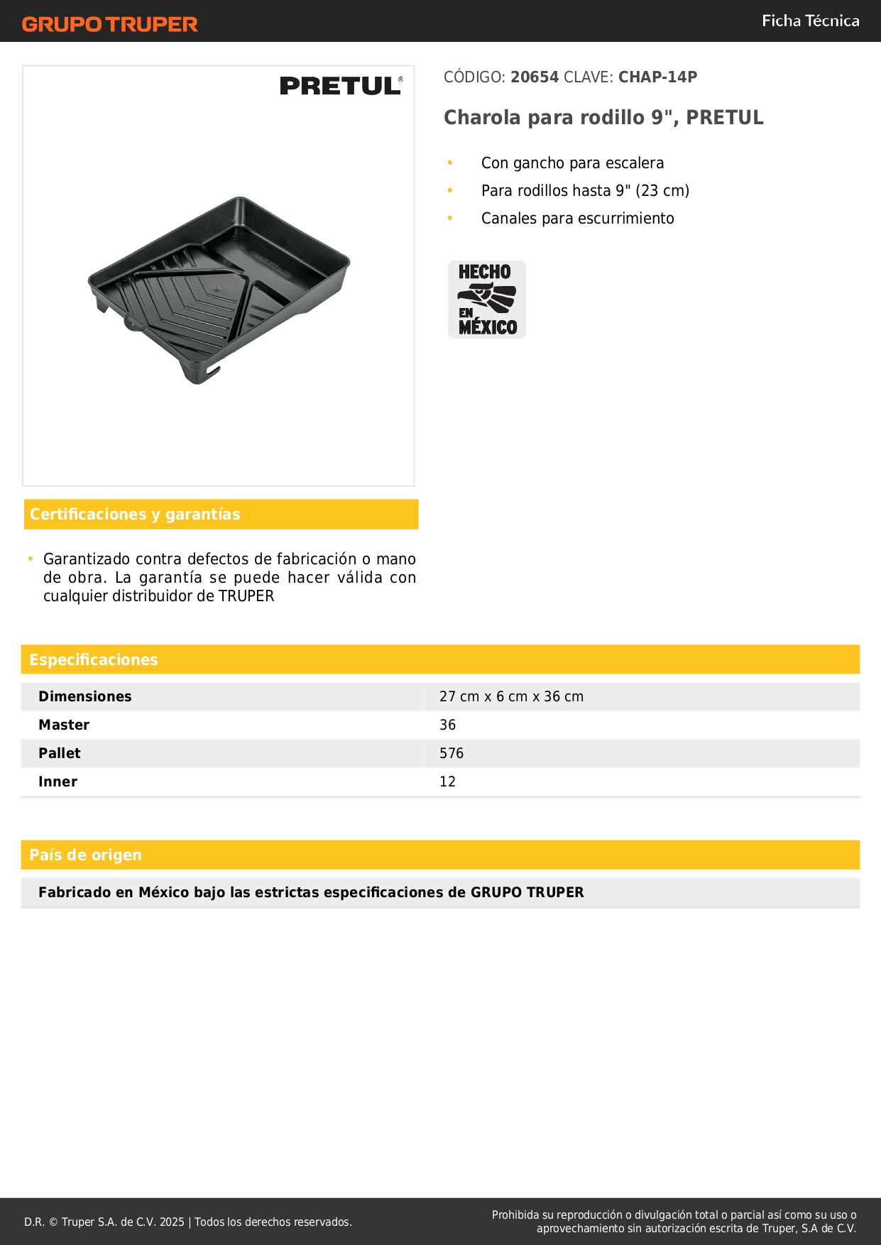 Charola de plástico 14' para rodillo, Pretul Stock por sucursal Stock por sucursal S/ 6.00 cantidad Agregar al carro Avísame cuando llegue -Con gancho para escalera-Para rodillos hasta 9" (23 cm)-Canales para escurrimiento