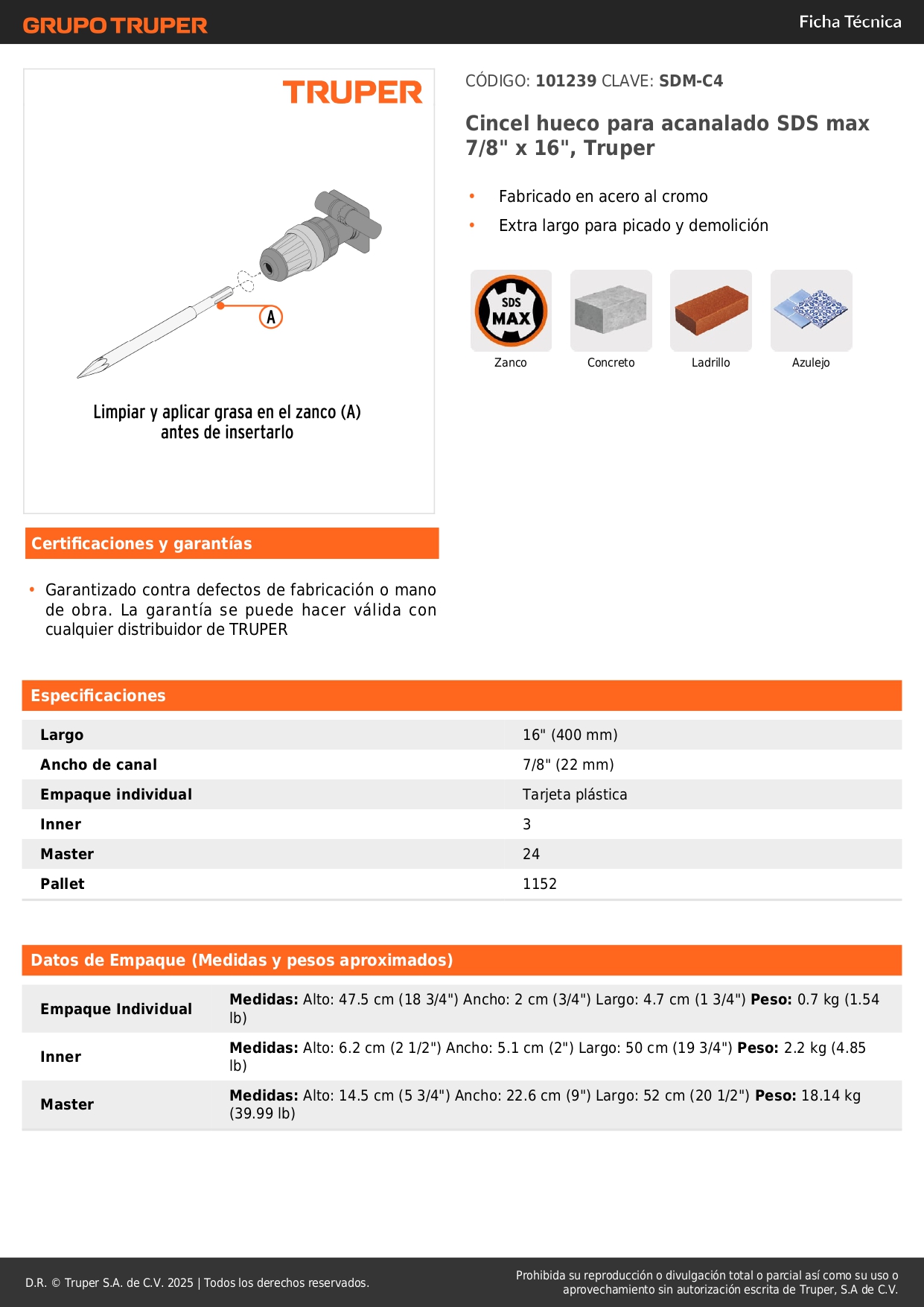 Cincel hueco para acanalado sds max 7/8" x 16", truper Stock por sucursal Stock por sucursal S/ 34.00 cantidad Agregar al carro Avísame cuando llegue -Fabricado en acero al cromo-Extra largo para picado y demolición