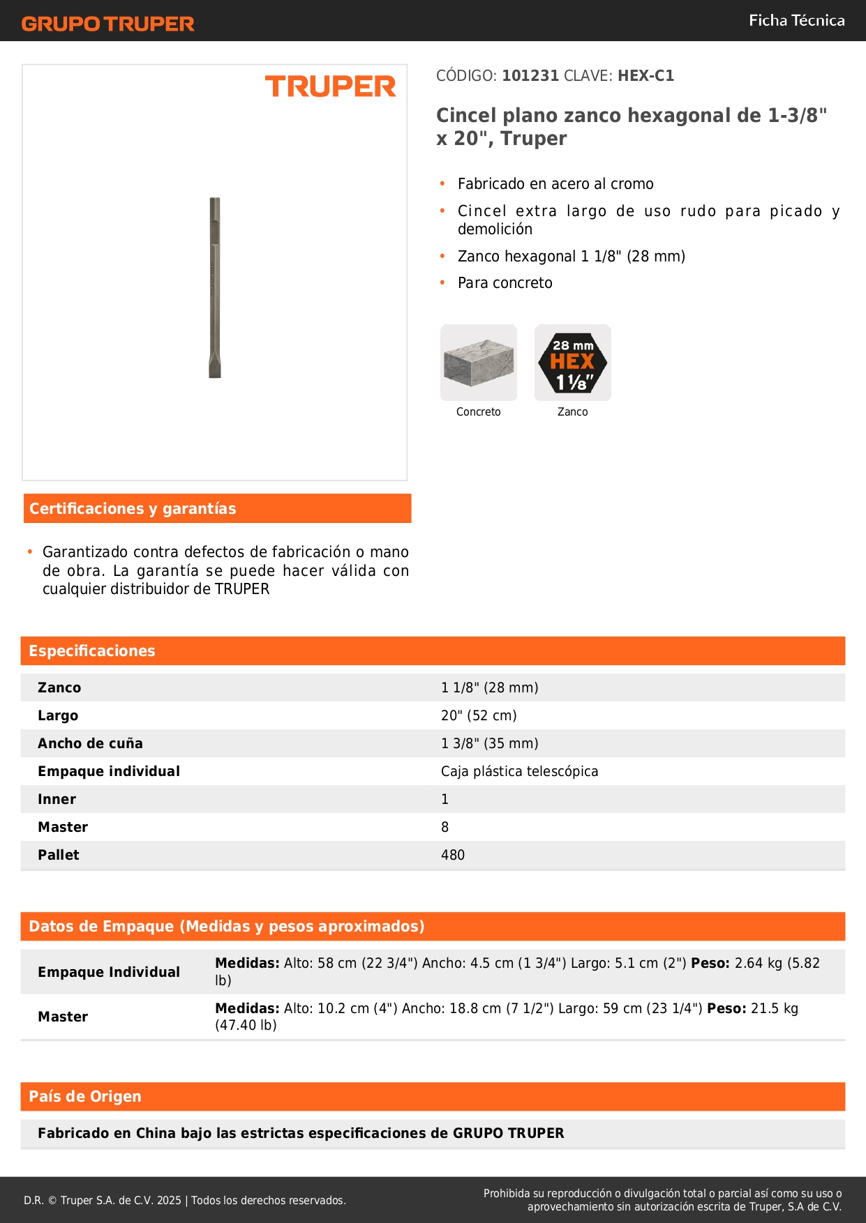 Cincel plano zanco hexagonal de 1 1/8´´, de 20´´ X 1.5´´ Truper