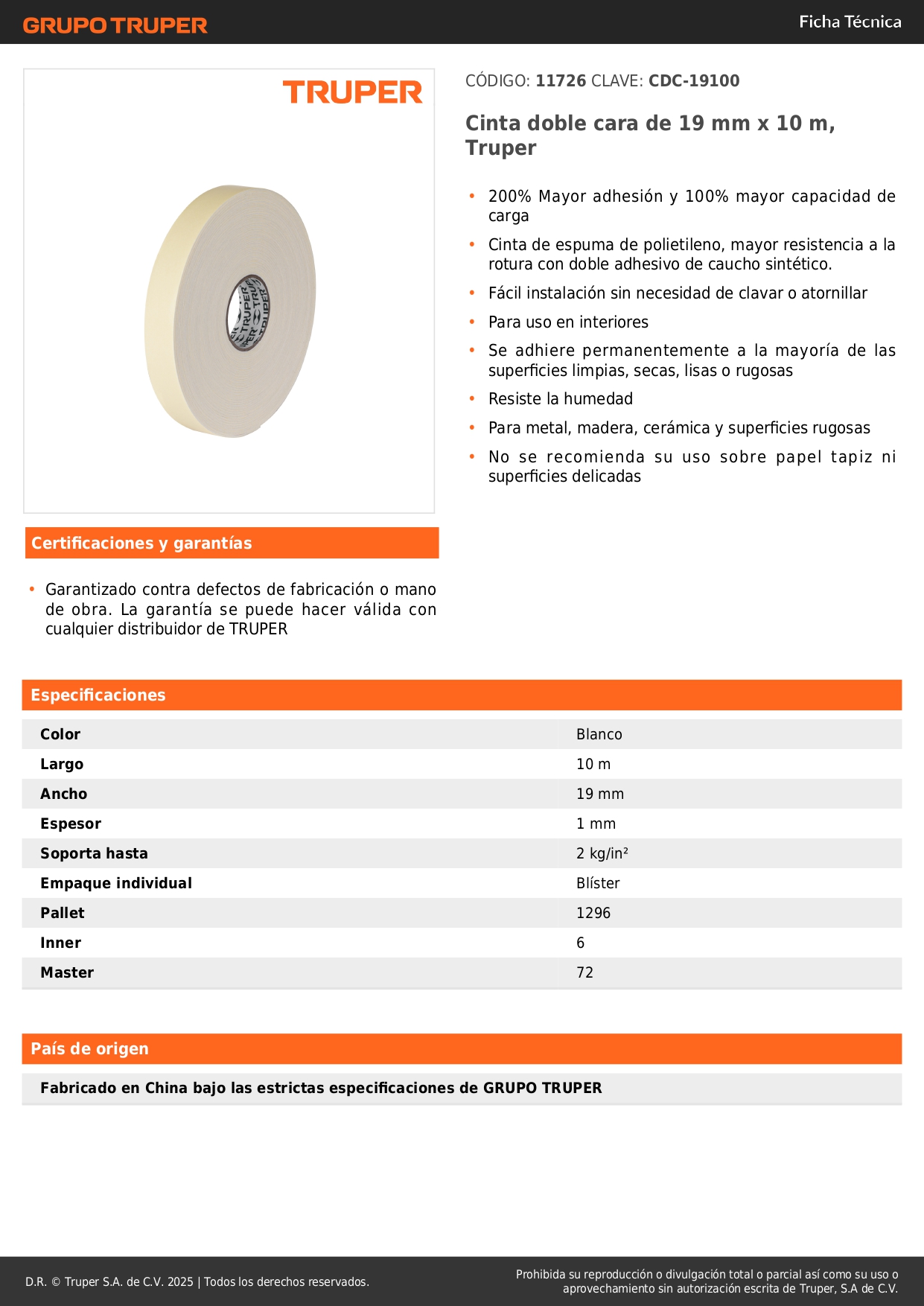 Cinta doble cara de 19 mm x 10 m, Truper
