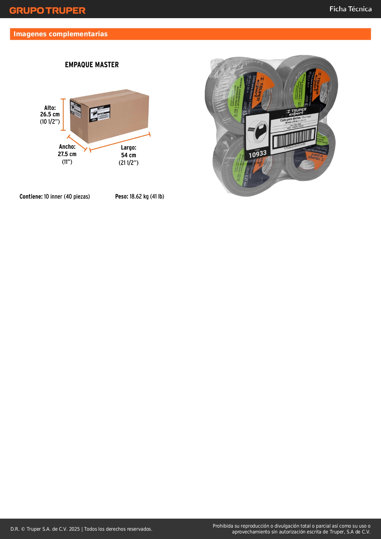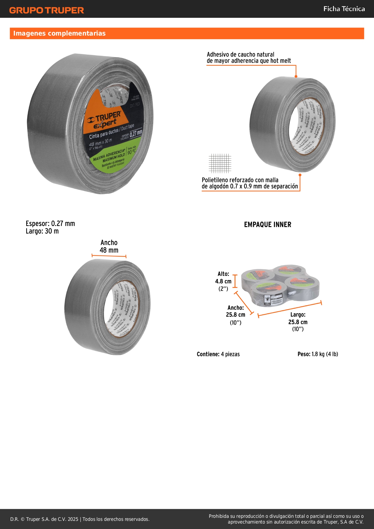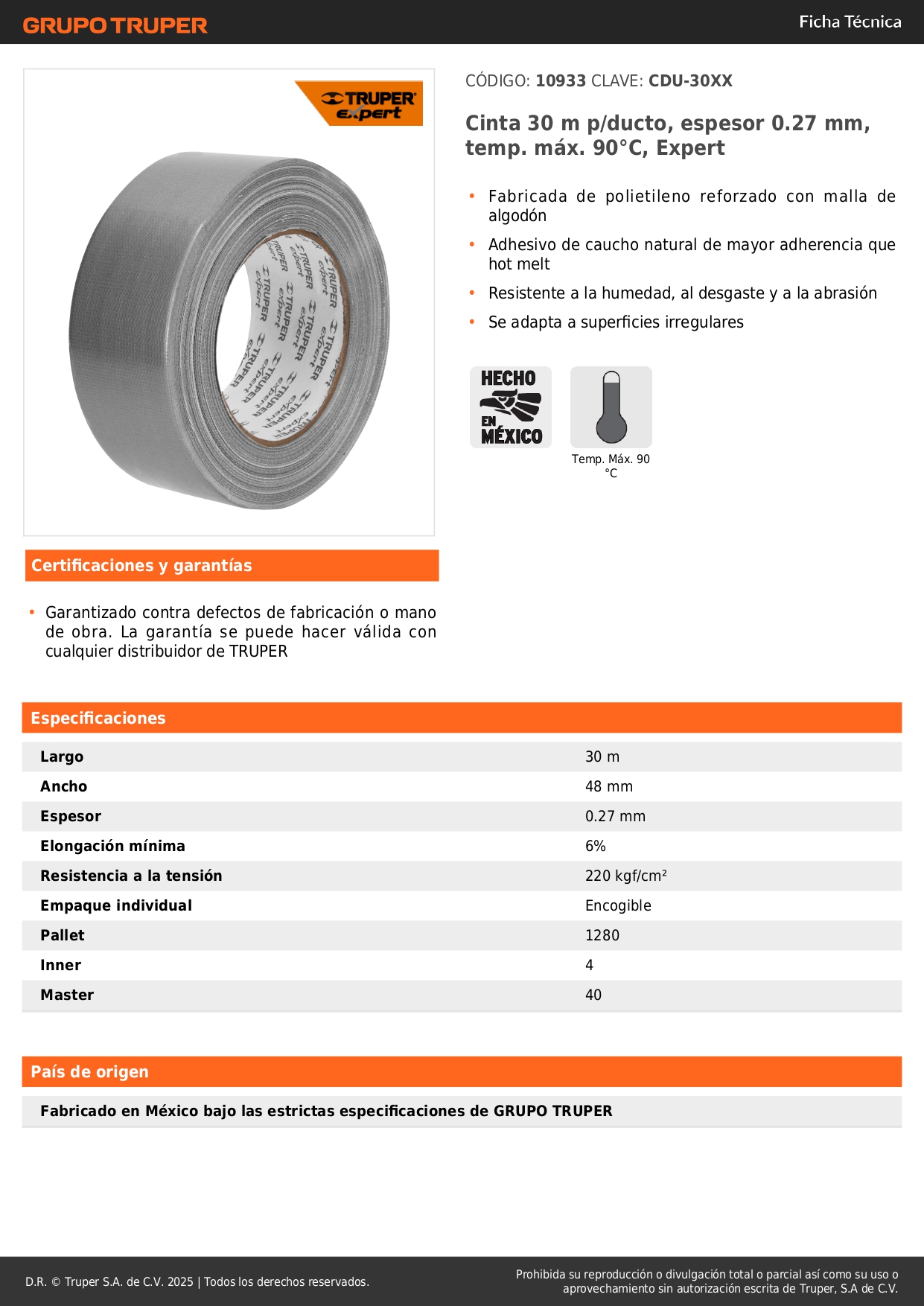 Cinta ducte tape 30 m espesor 0.27 mm, temp. máx. 90°C, Expert Truper