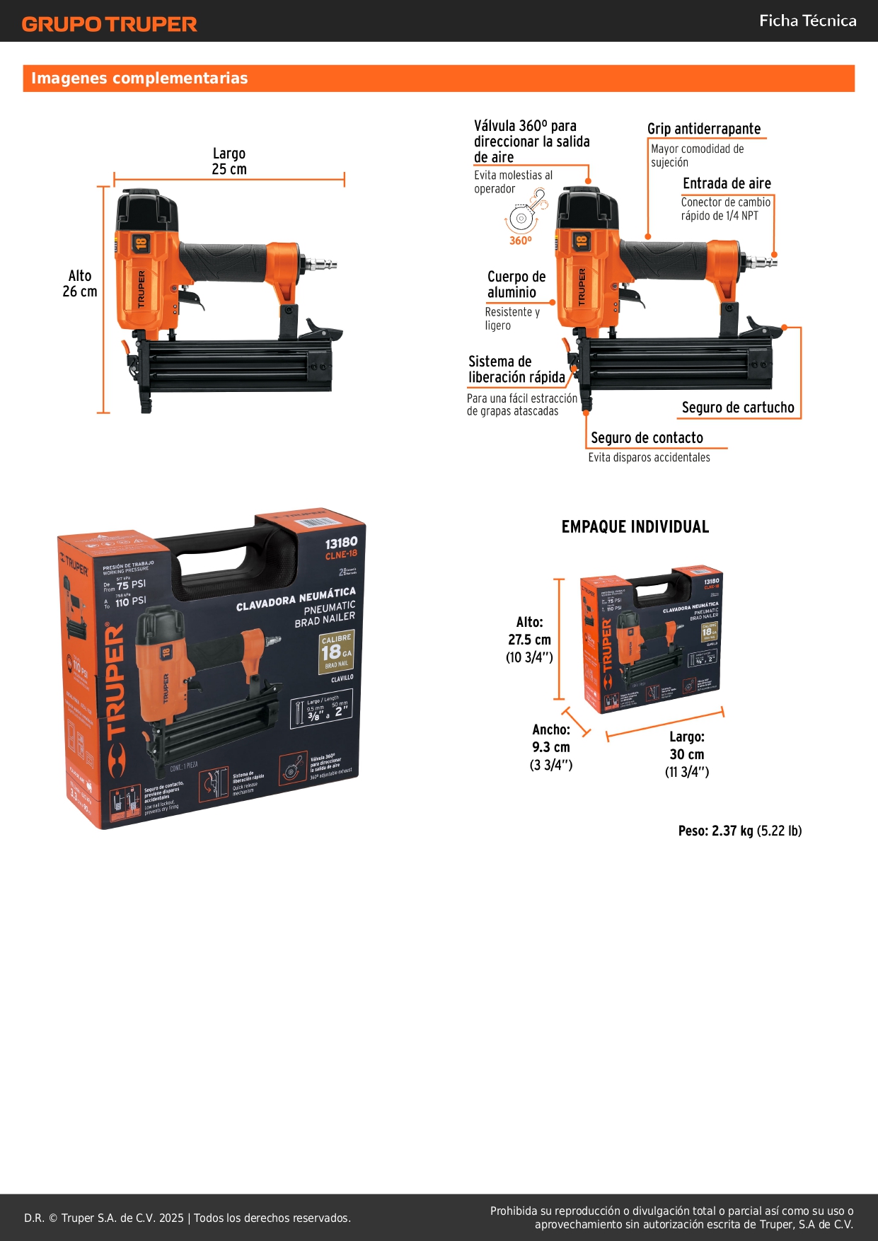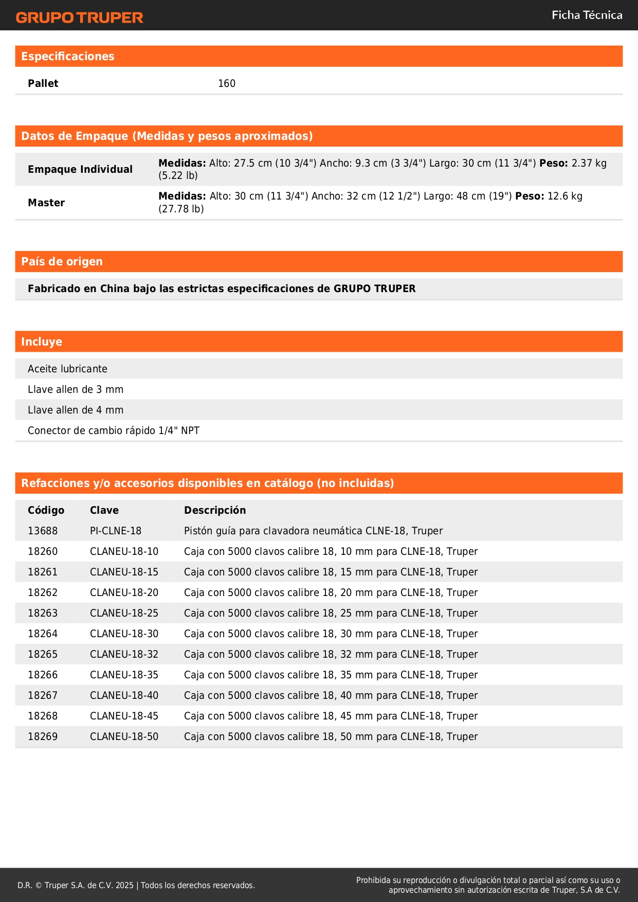 Largo de clavos 3/8" (10 mm), 5/8" (15 mm), 3/4" (20 mm), 1" (25 mm), 1 3/16" (30 mm), 1 1/4"