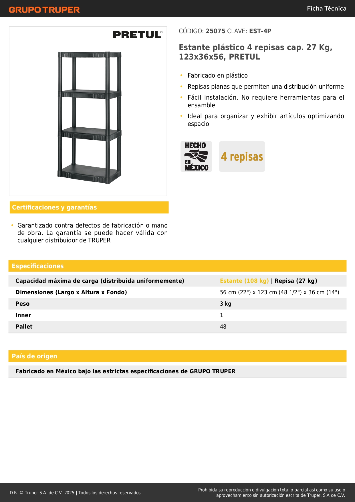 "El estante de plástico con 4 repisas es una solución versátil y práctica para organizar y exhibir tus pertenencias. Fabricado con plástico resistente de alta calidad, este estante ofrece durabilidad y ligereza al mismo tiempo. Con cuatro repisas espaciosas, proporciona amplio espacio de almacenamiento para organizar tus objetos de manera ordenada.