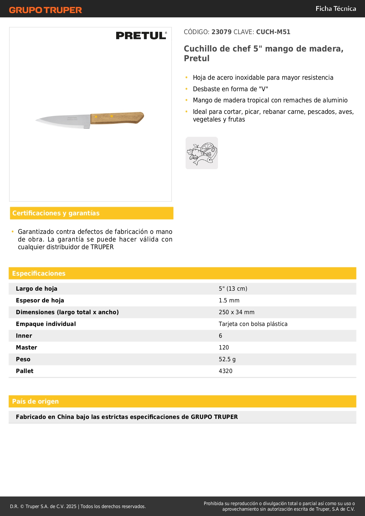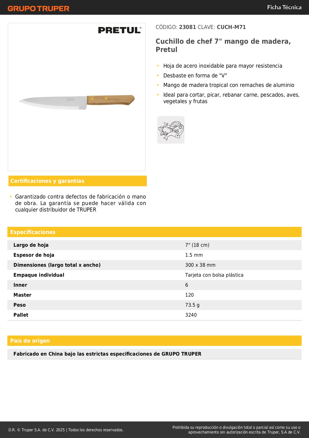 Ideal para cortar, picar, rebanar carne, pescados, aves, vegetales y frutas