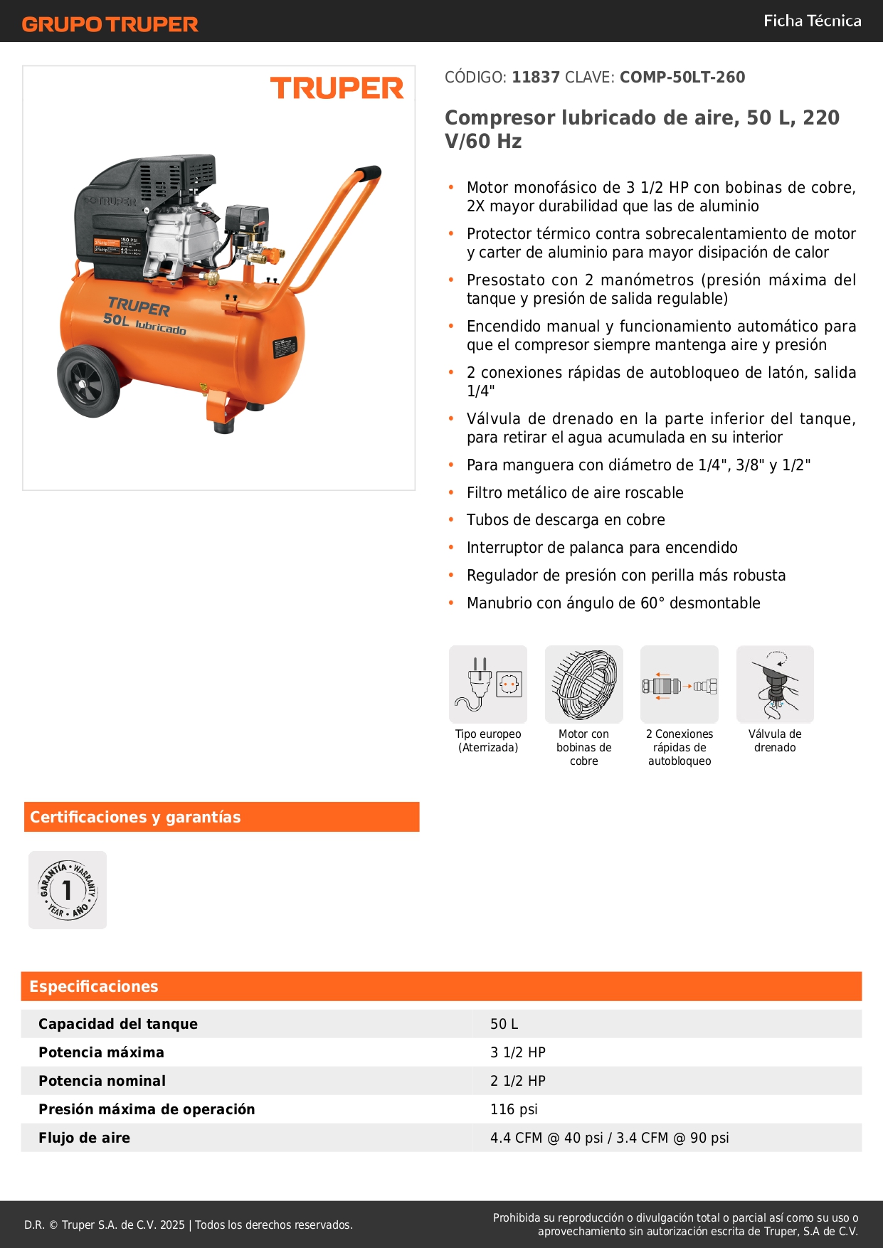 - Capacidad del tanque: 50 L.