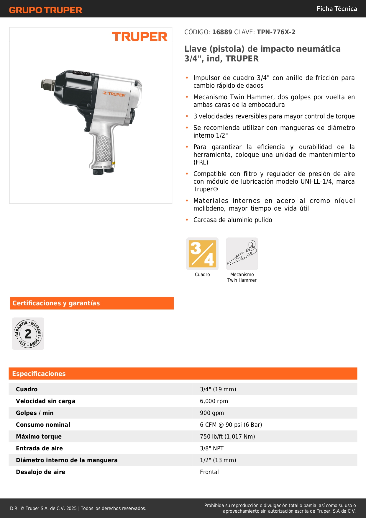 - Flujo de aire: 4,4 CFM @ 40 PSI - 3,4 CFM @ 90 PSI.