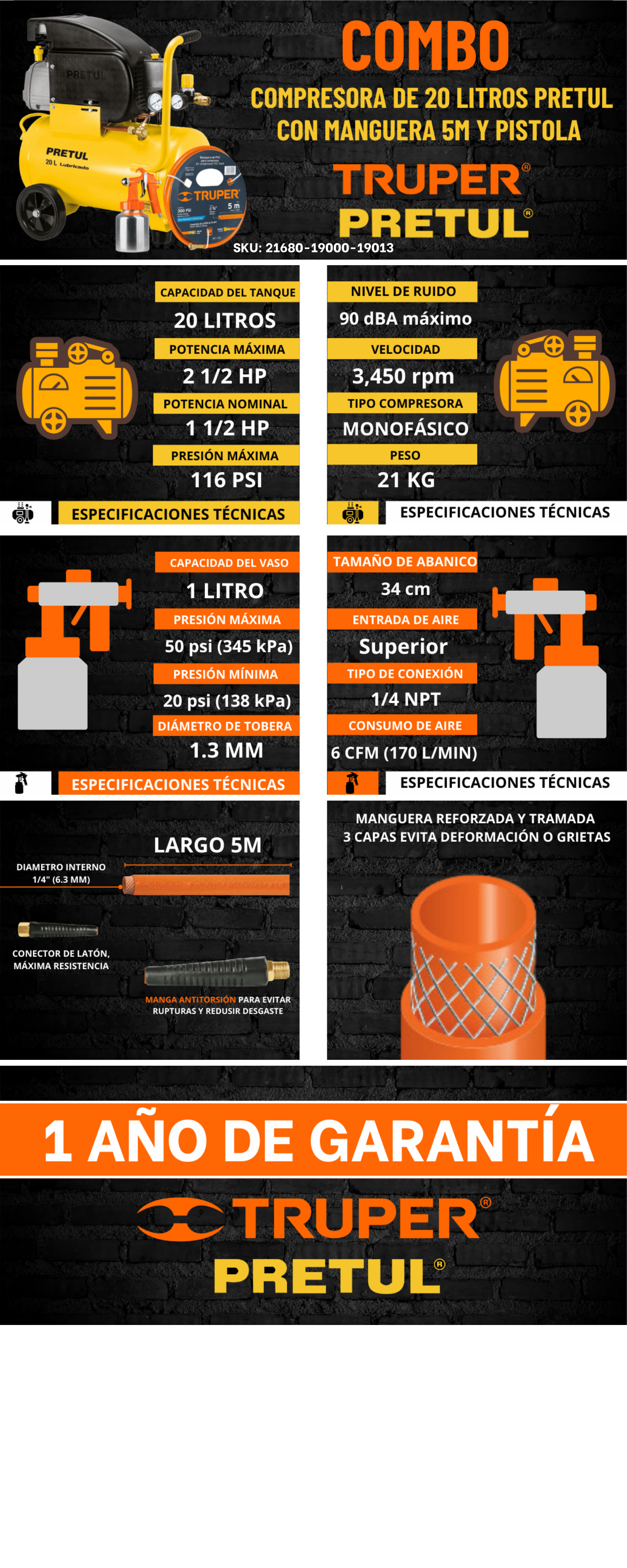 Combo compresora de 20 litros pretul con manguera 5m y pistola Truper