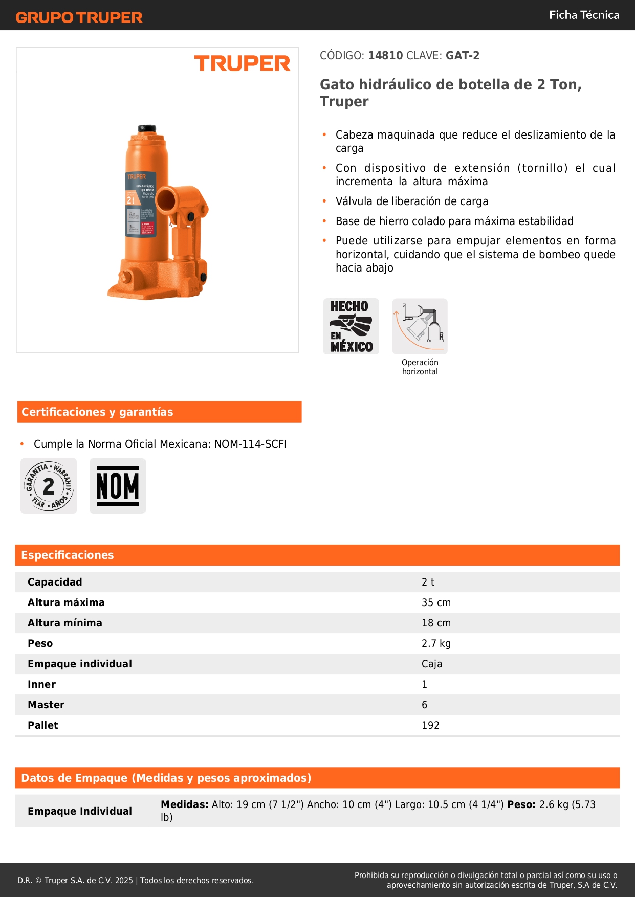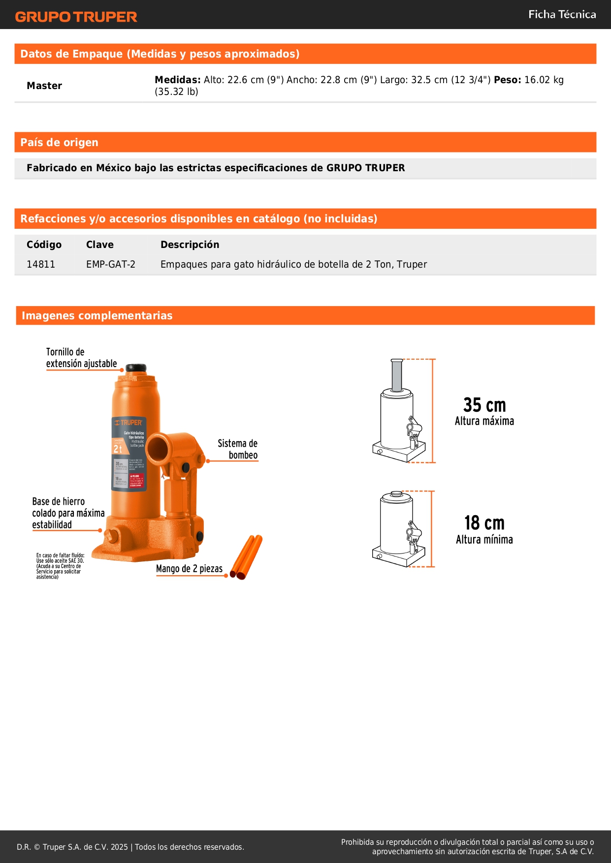 *Para un óptimo funcionamiento utilice aceite hidráulico SAE-30.