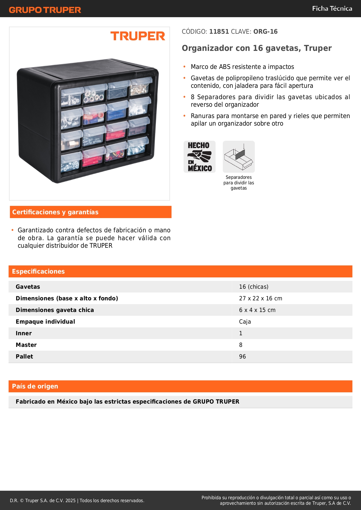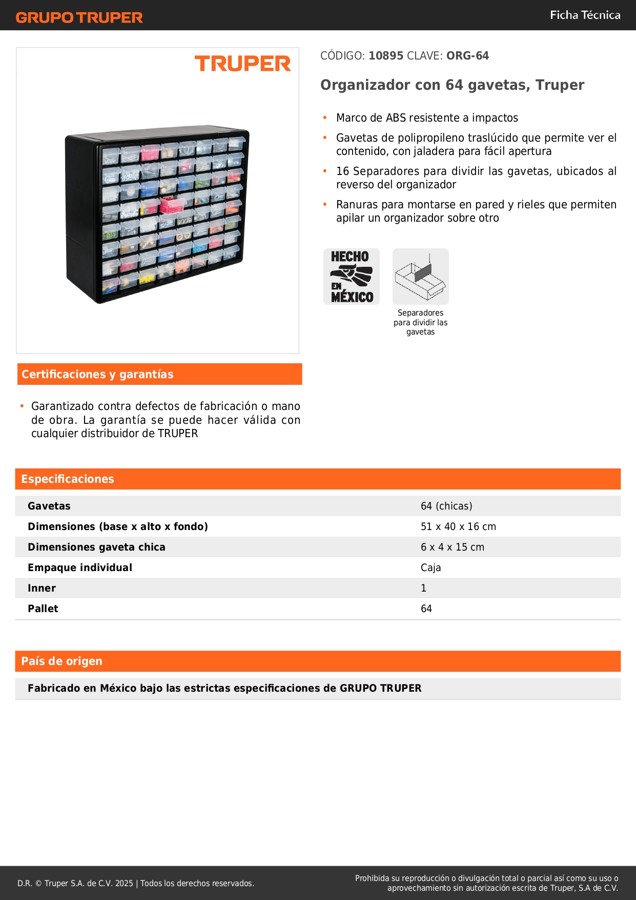 - Incluye 16 separadores en el organizador de 64 gavetas y 8 separadores en el organizador de 16 gavetas. Estos separadores sirven para dividir las gavetas en dos.