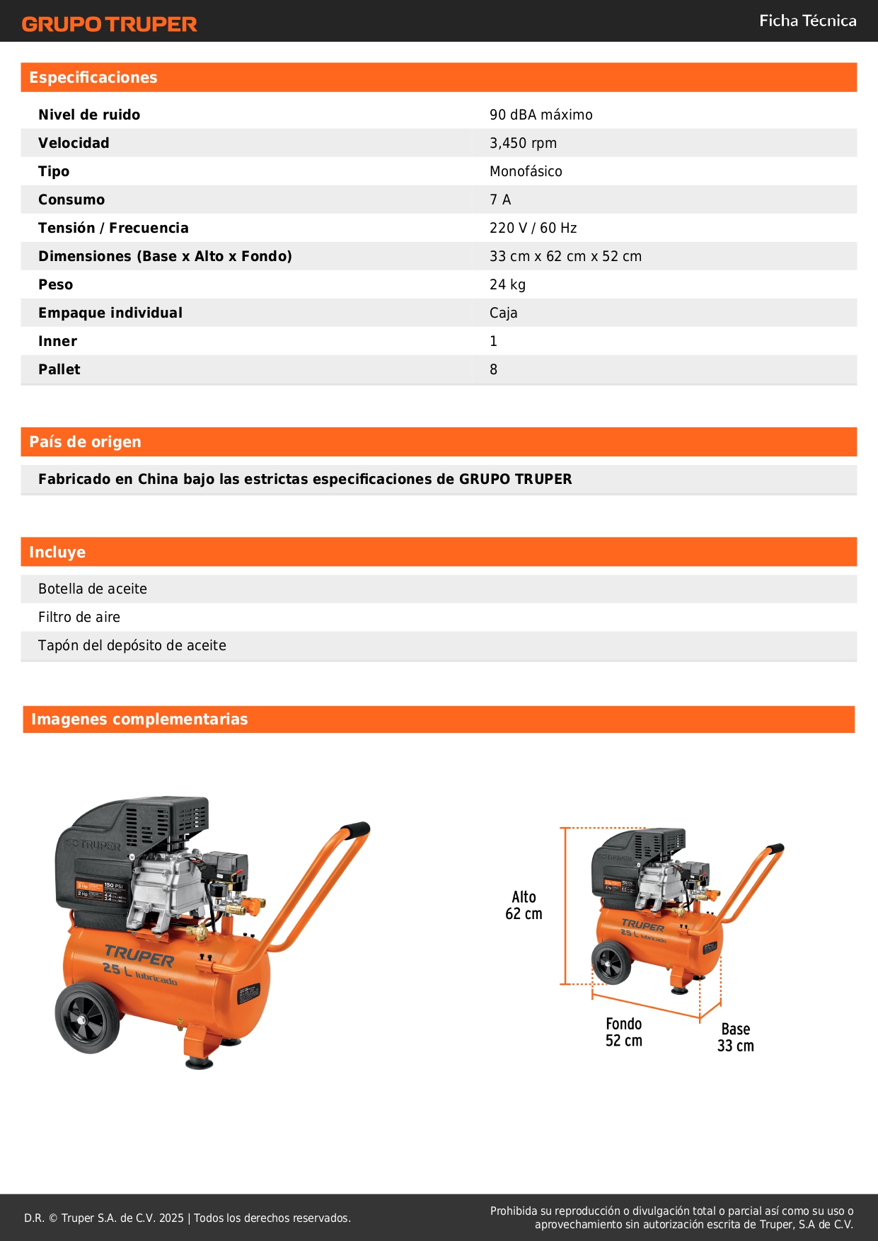 Compresor lubricado de aire, 25 L, 220 V/60 Hz