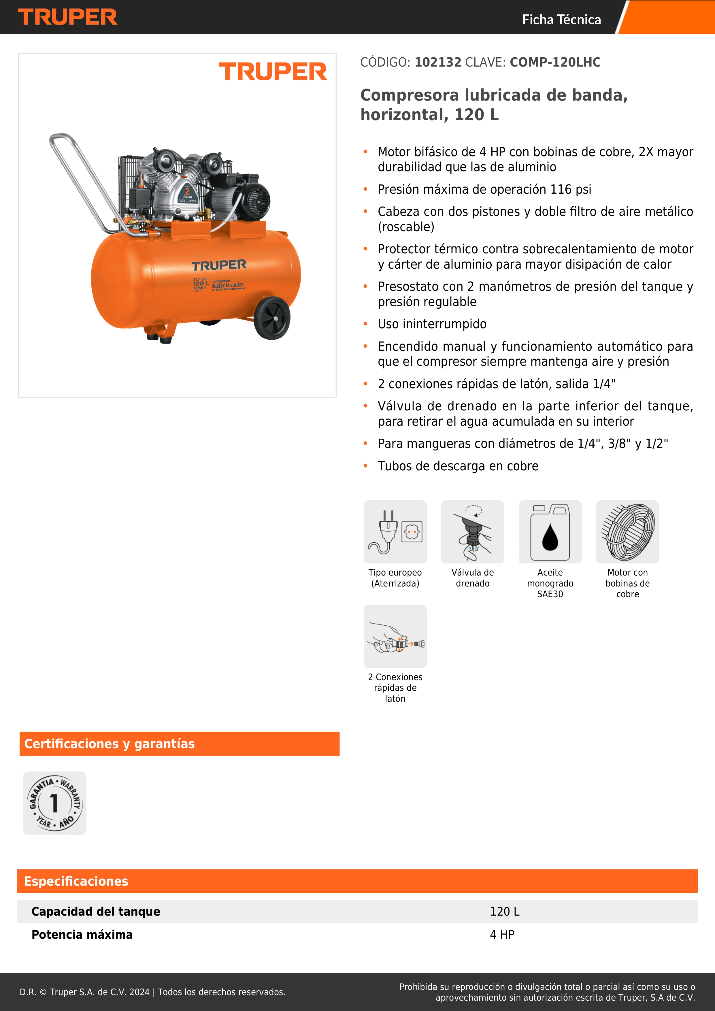 Compresora lubricada de banda 120 litros Horizontal Truper