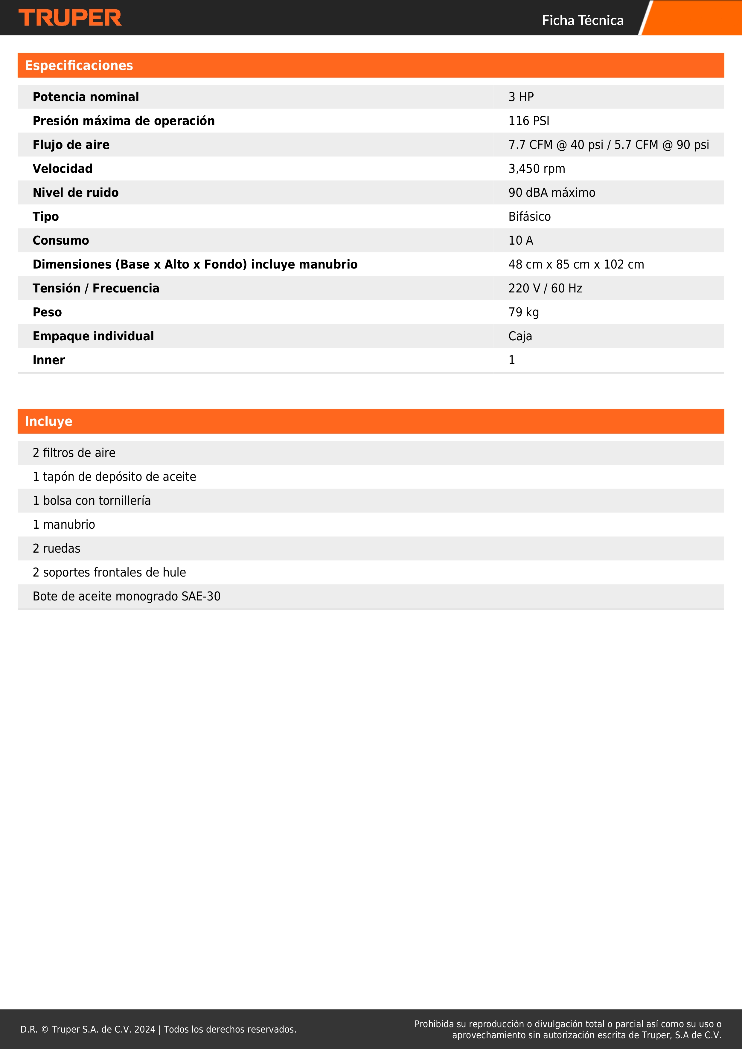 - Tensión / Frecuencia: 220 V / 60 Hz.