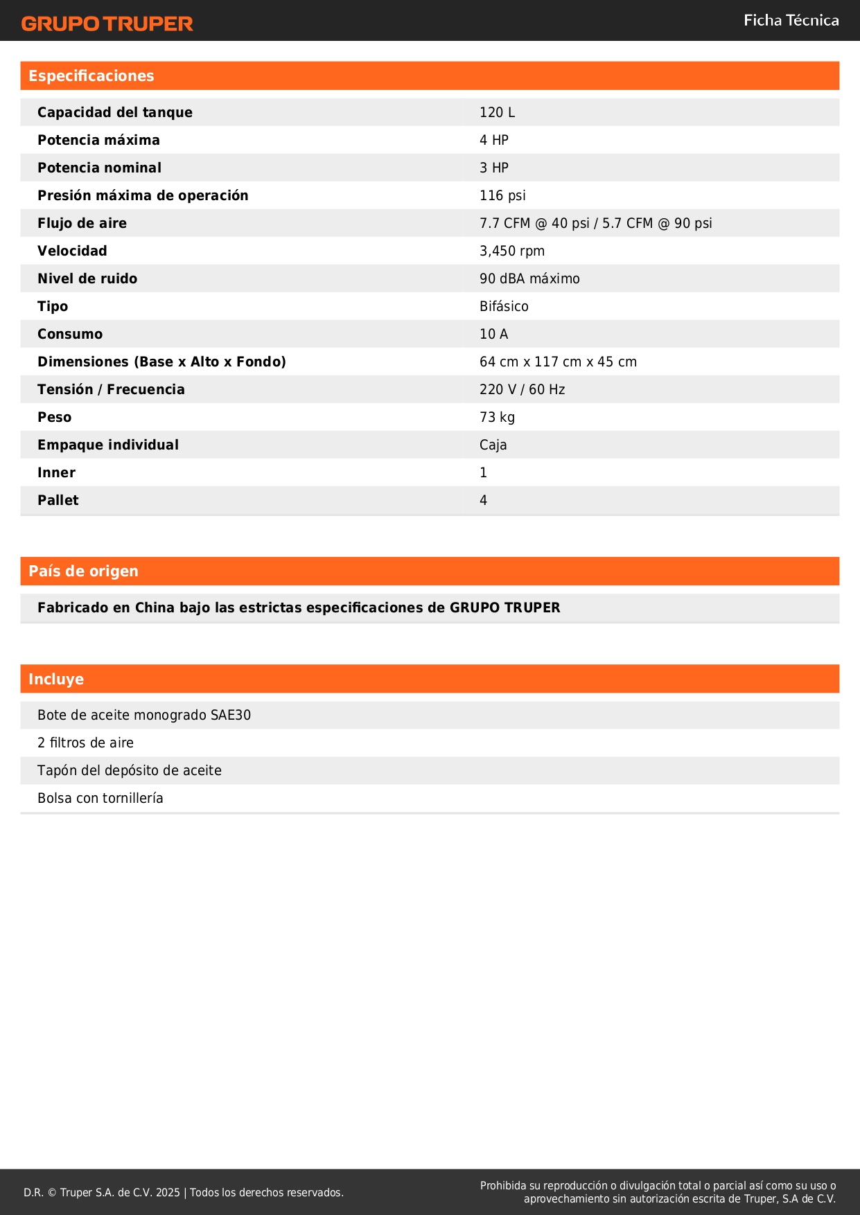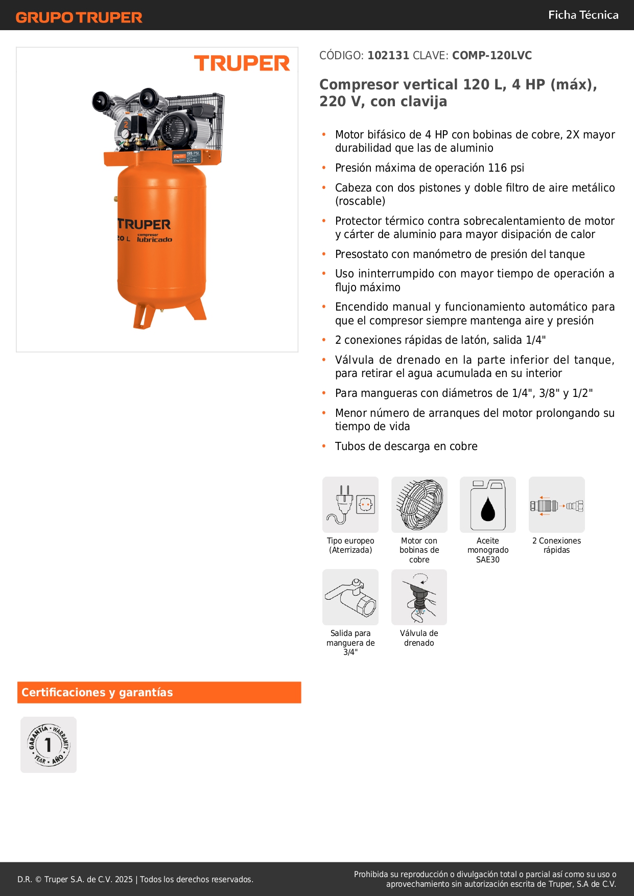 - Presión máxima de operación: 116 PSI.