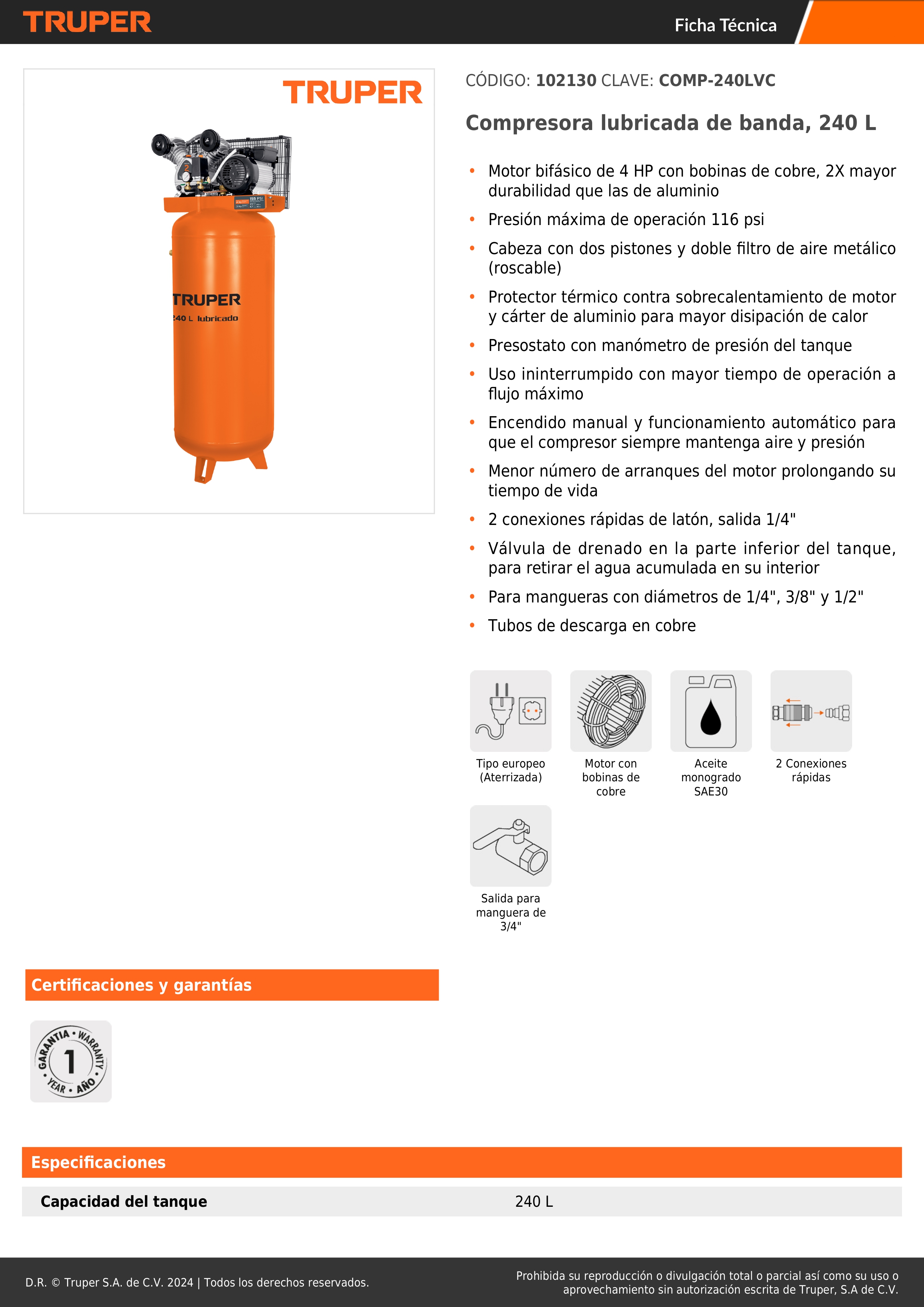 Capacidad del tanque 240 L
