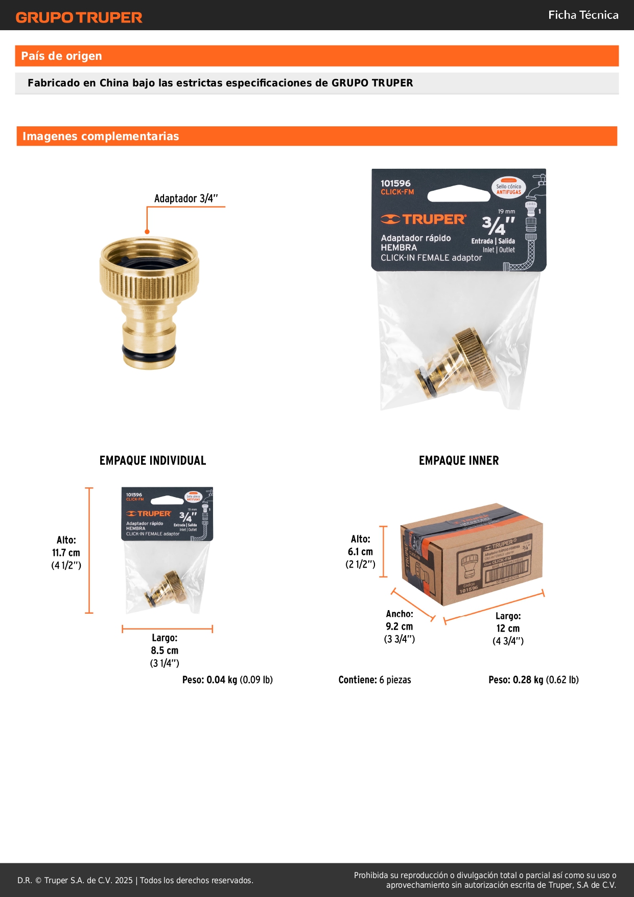Conector rápido hembra de latón de 3/4": Este es el componente que se adapta a la manguera. Está fabricado en latón, un material resistente y duradero. El tamaño de 3/4" indica el diámetro del conector, lo que sugiere que es compatible con mangueras estándar de ese tamaño.
