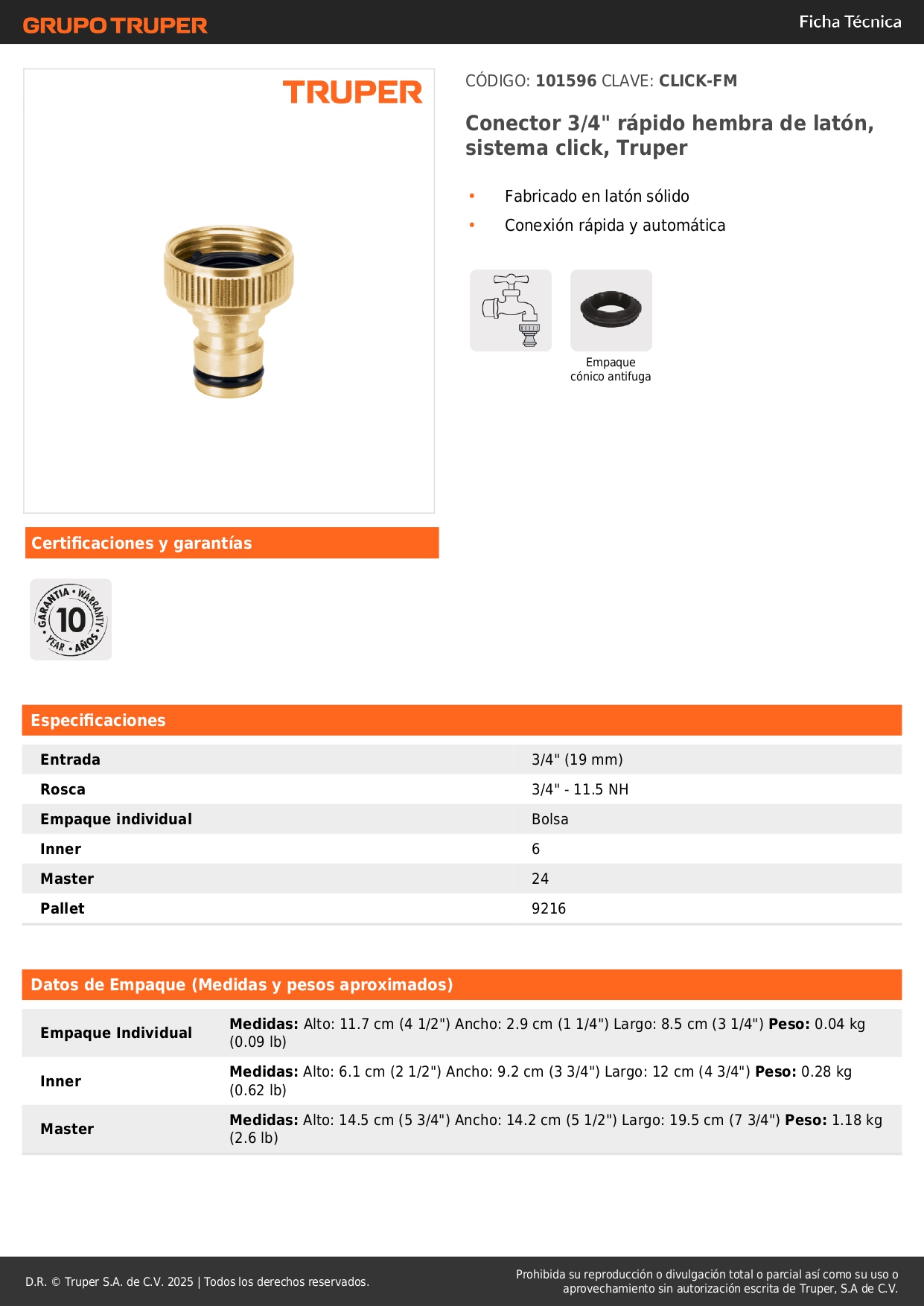 Conector 3/4" rápido hembra de latón, sistema click, Truper