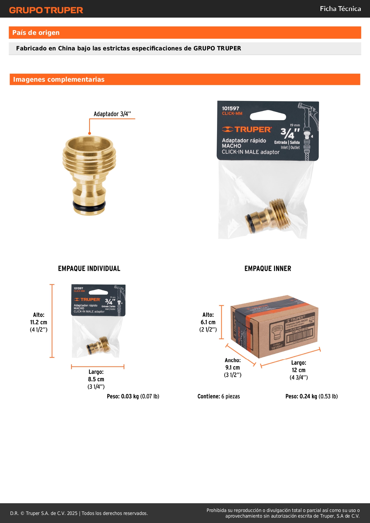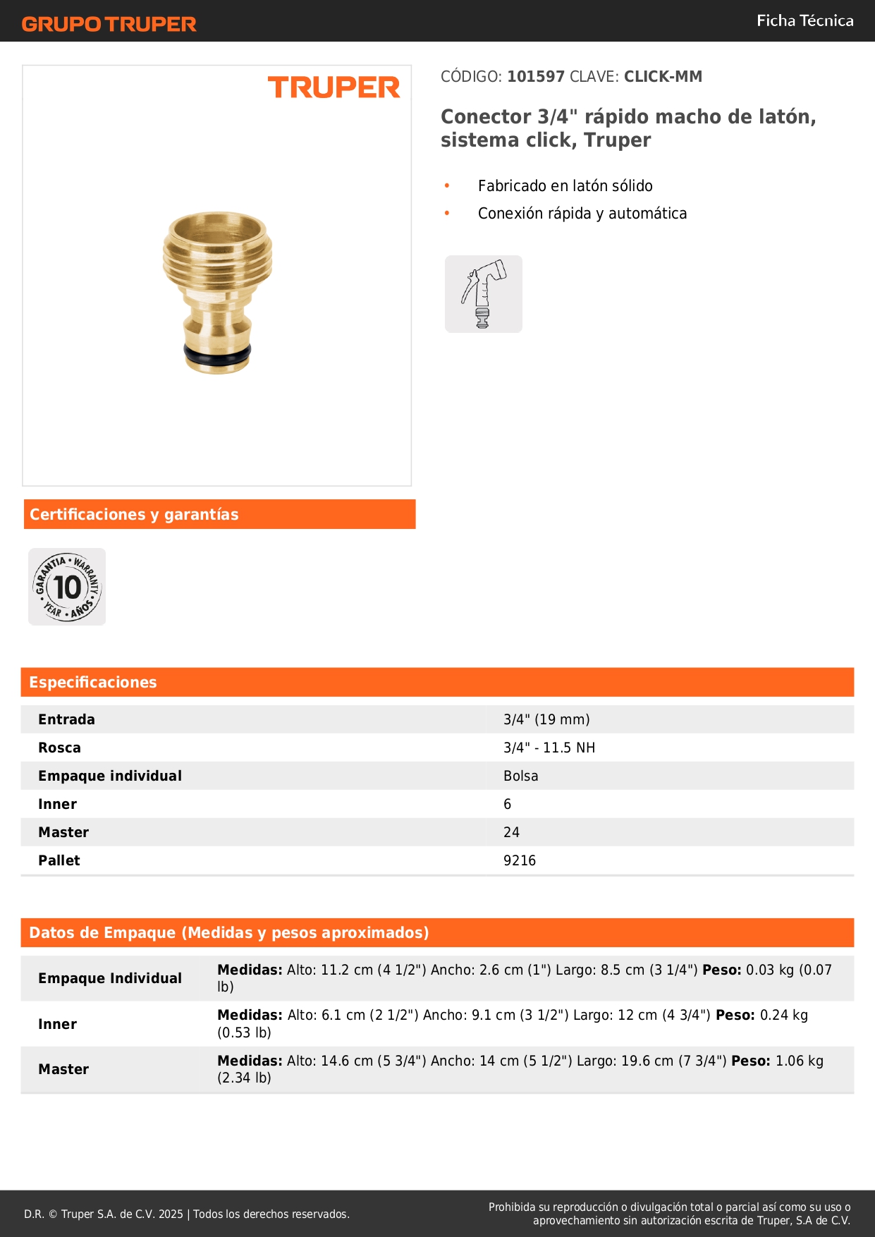 Conector 3/4" rápido macho de latón, sistema click, Truper