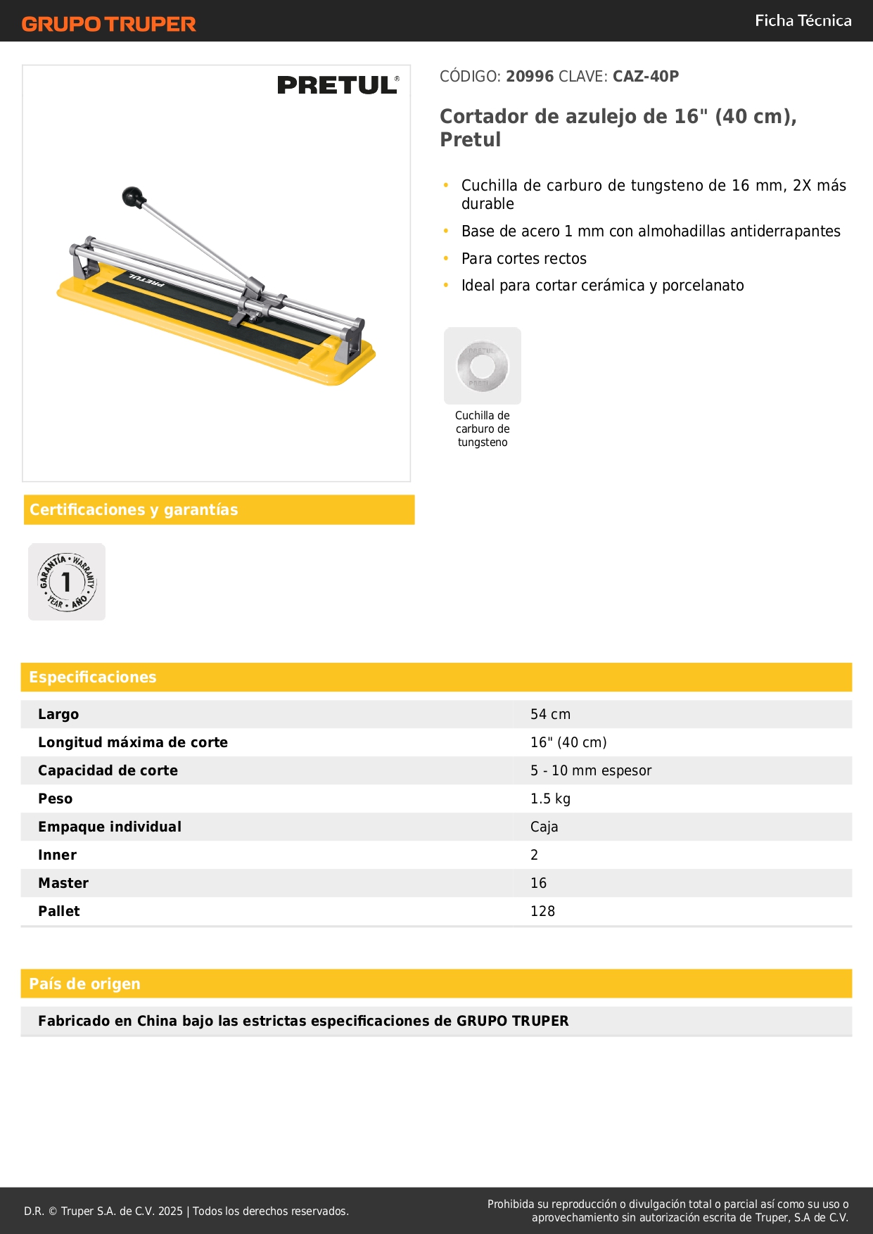 Cortador de mayólica De 16" 41 cm Pretul