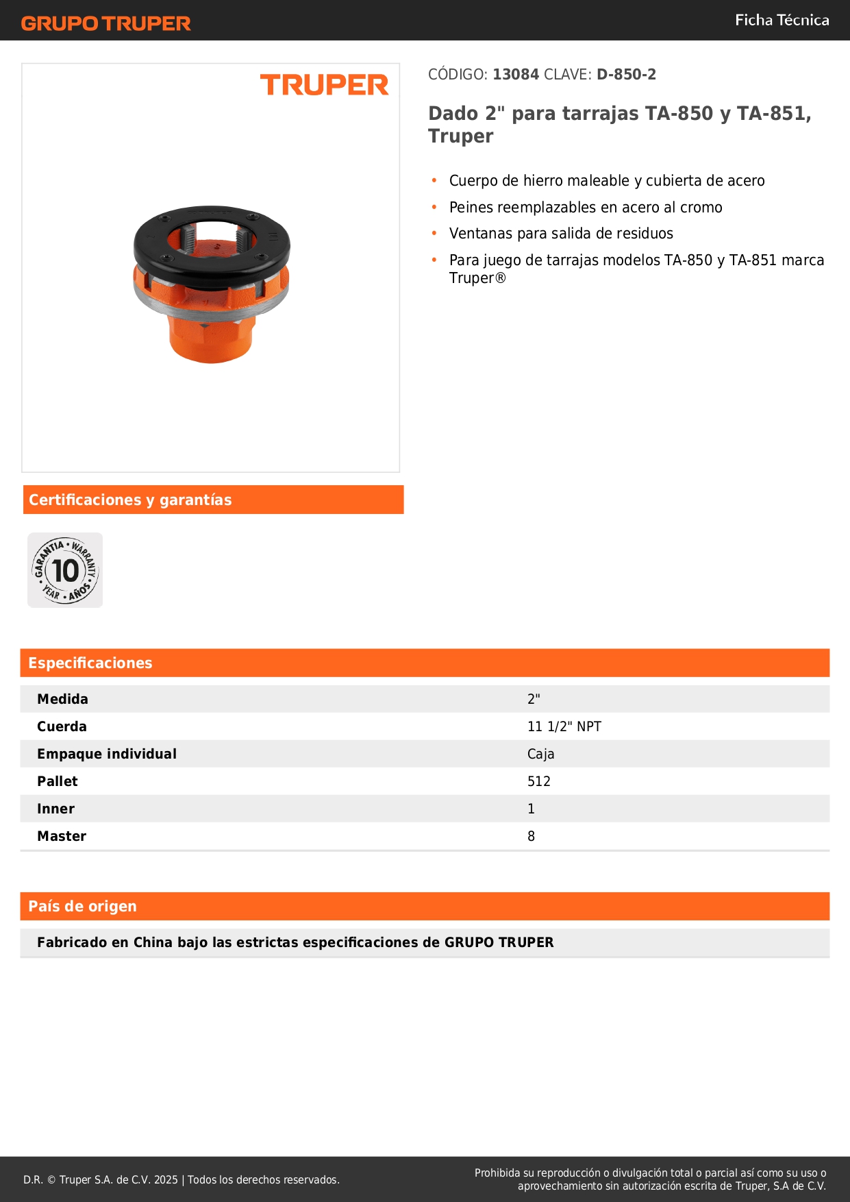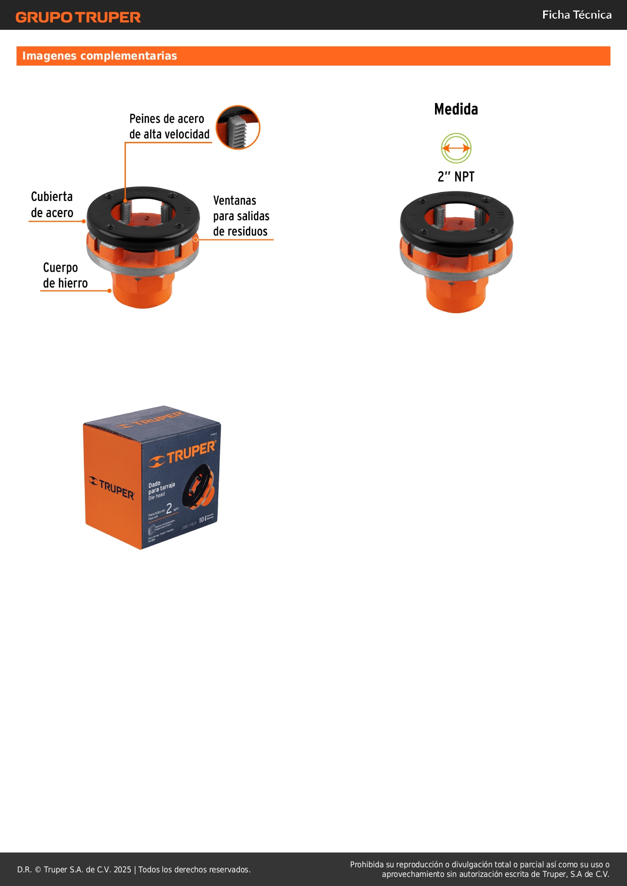 Dado 2´´ para tarrajas TA-850 y TA-851, Truper