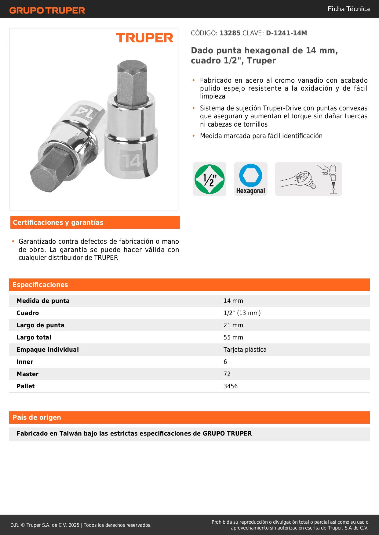 Dado de punta hexagonal encastre 1/2'' de 14 mm. truper