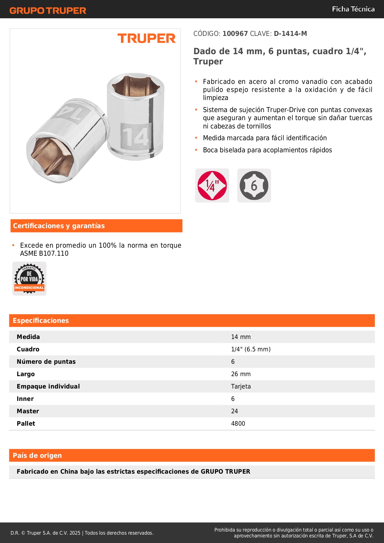 Dado hexagonal encastre 1/4'' de 14 mm. truper