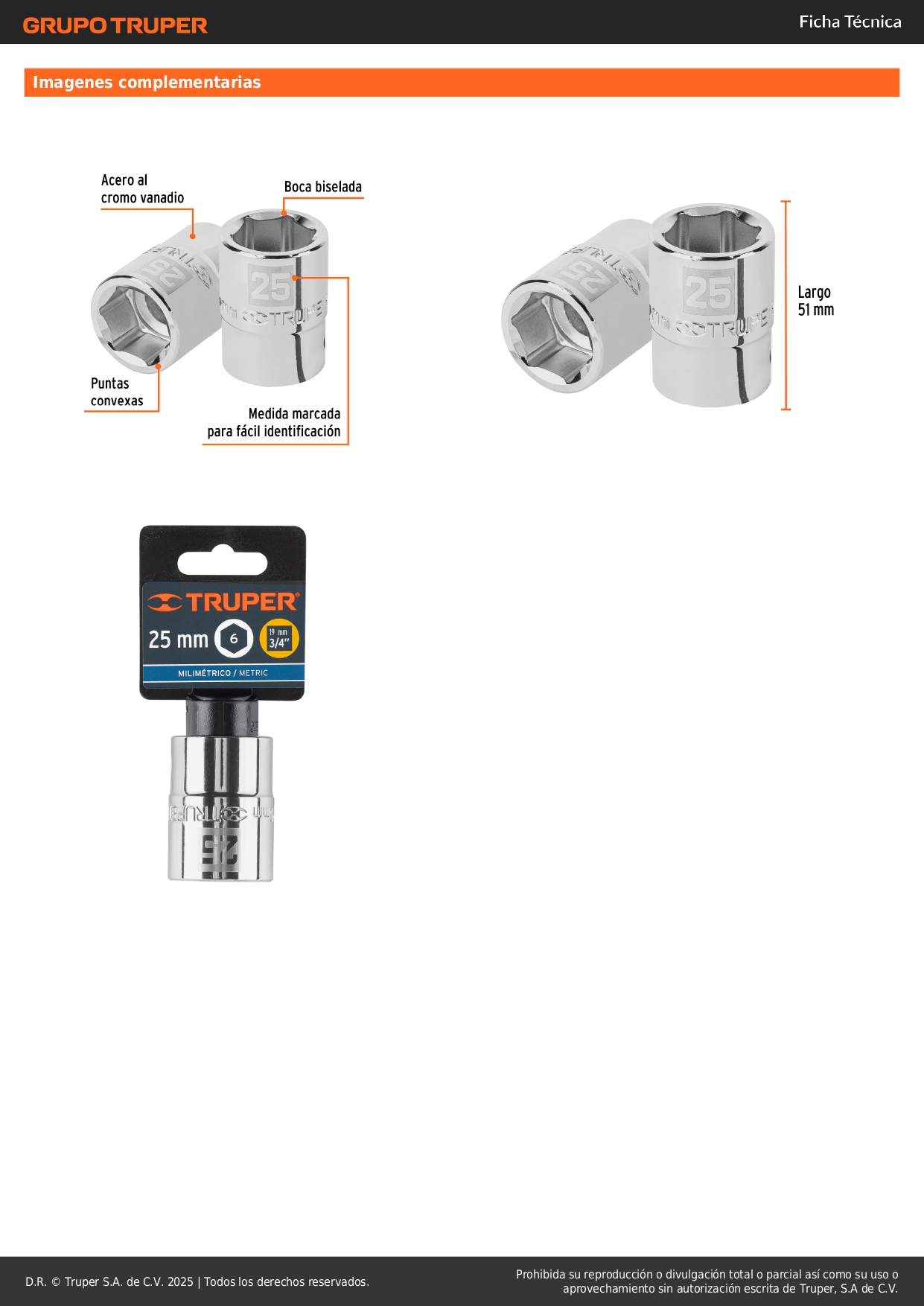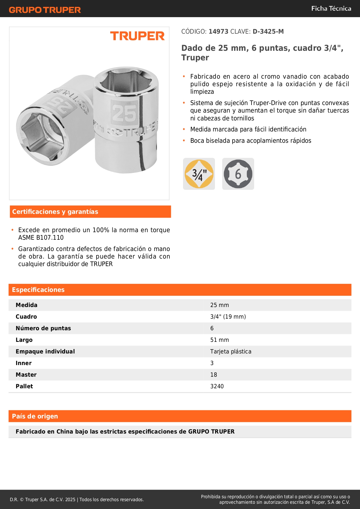 Dado hexagonal encastre 3/4´´ de 25 mm, Truper