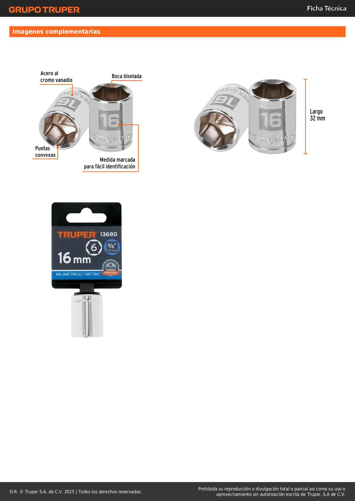 Dado hexagonal encastre 3/8'' de 16 mm. truper