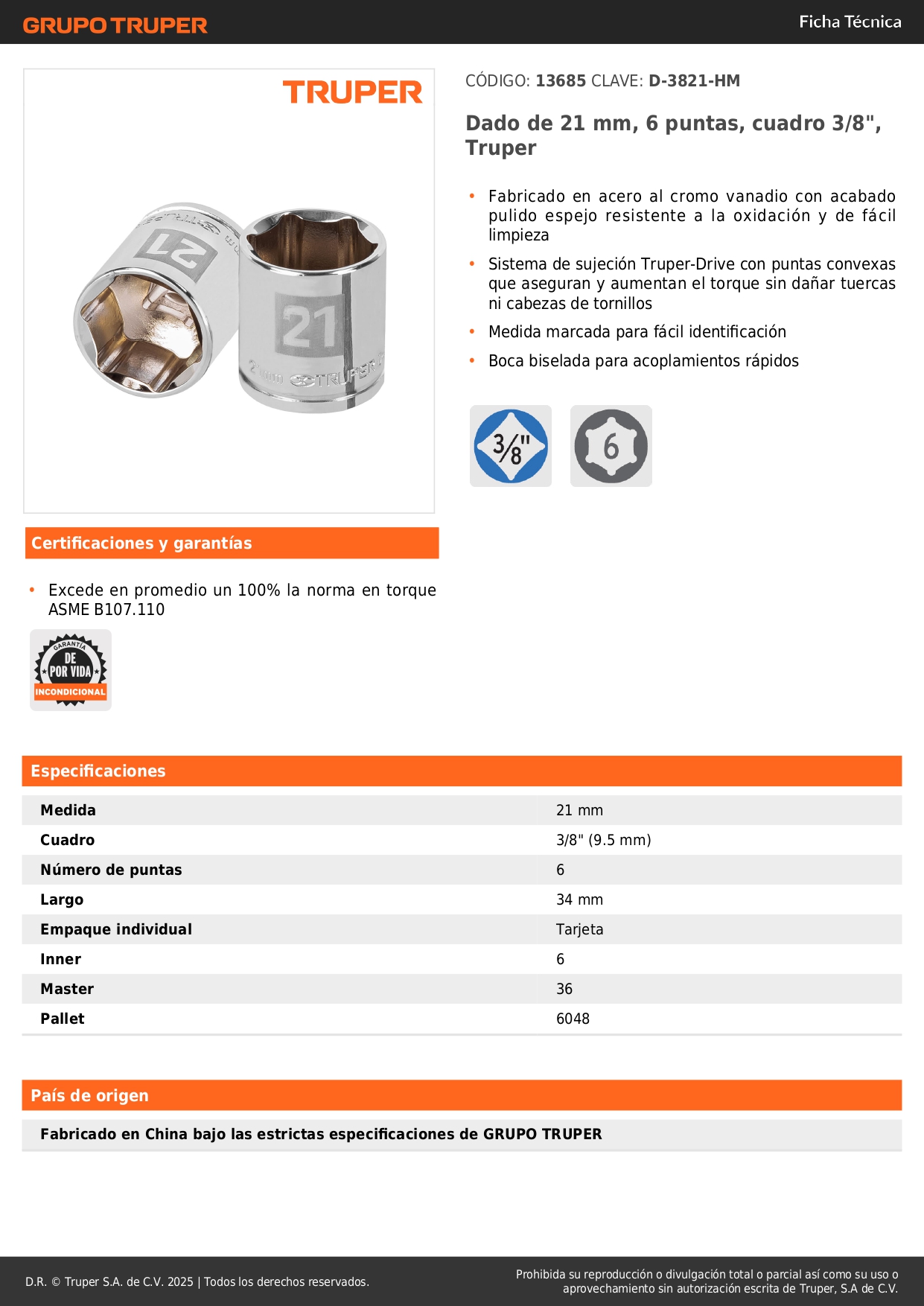 Dado hexagonal encastre 3/8'' de 21 mm. truper