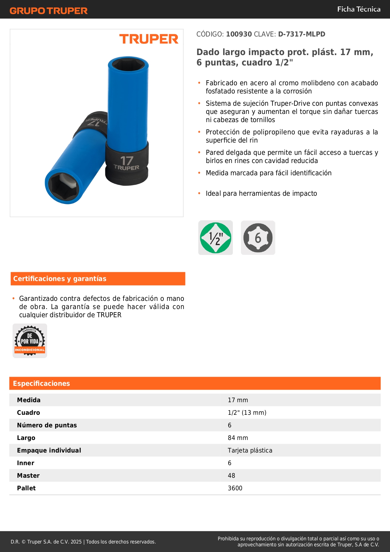 Dado largo impacto, 17mm, 6 p, protec plástica, cuadro 1/2´´ Truper